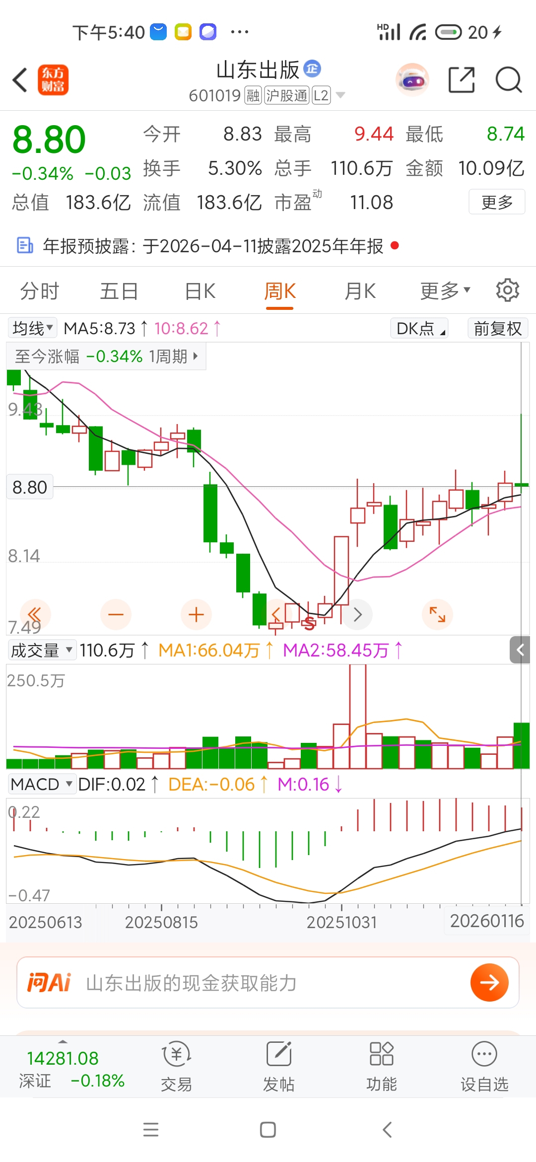 $山东出版(SH601019)$ 本周还跌0.34%,别的传媒本周即使大跌两天也是红的,纸质出版物千万别碰,涨的都是影视营销有Ai概念的传媒文化