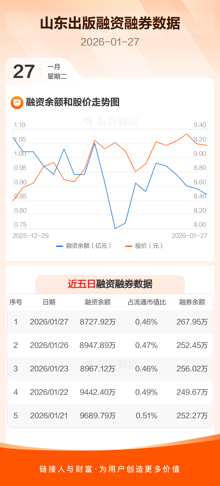交易所最新数据显示,山东出版于2026年1月27日获融资买入473.37万元,融资偿还693.33万元,当日融资净偿还219.97万元。目前,该股融资余额8727.92万,占流通市值比例为0.46%。