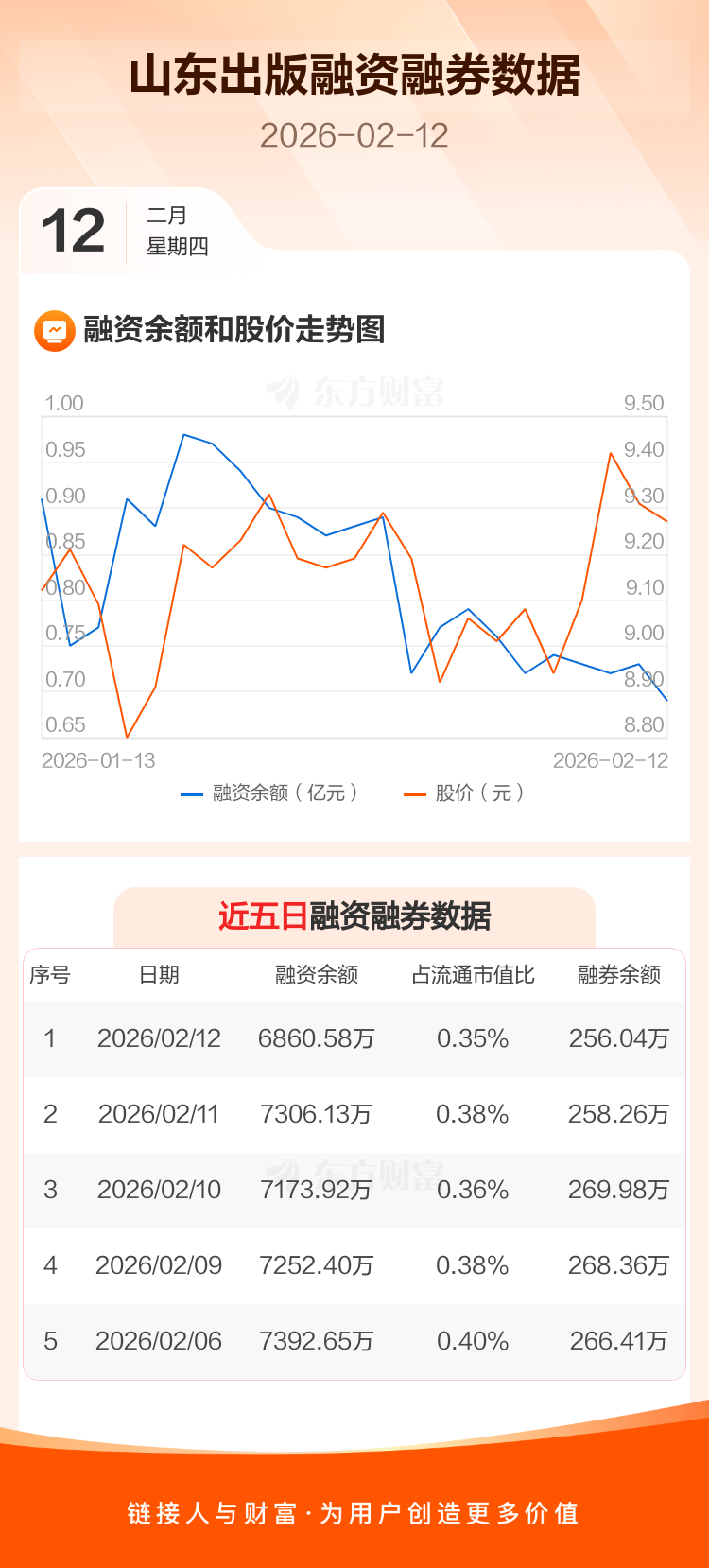 交易所最新数据显示,山东出版于2026年2月12日获融资买入461.70万元,融资偿还907.25万元,当日融资净偿还445.55万元。目前,该股融资余额6860.58万,占流通市值比例为0.35%。