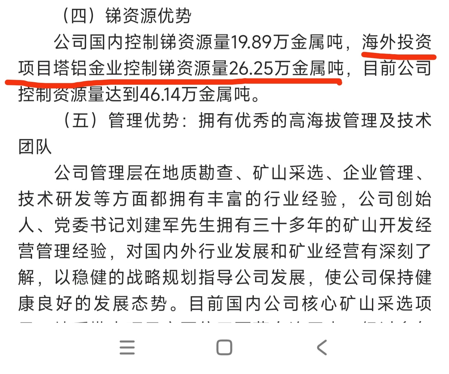半年报显示塔铝金矿有26.25万吨锑,照目前国际市场2万美金/1吨计算,价值52