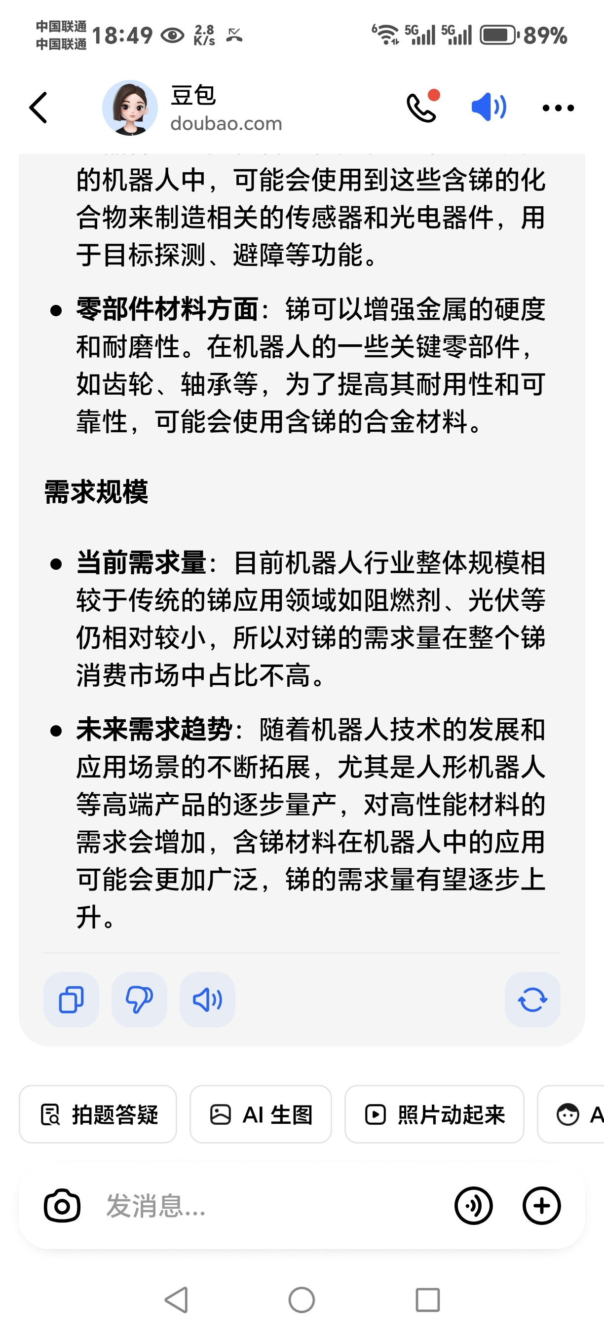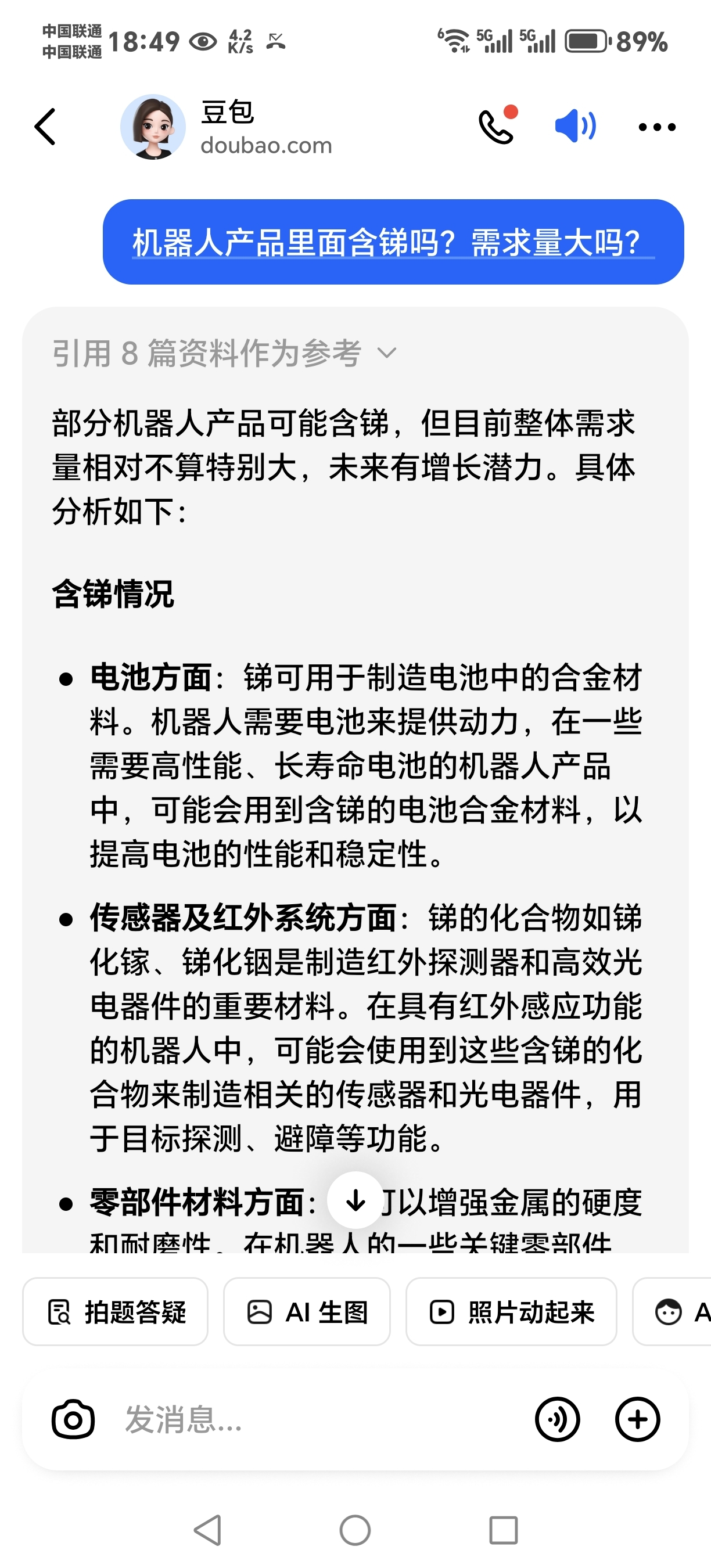 人形机器人零部件产品材料远红外电池里面含锑,需求量大