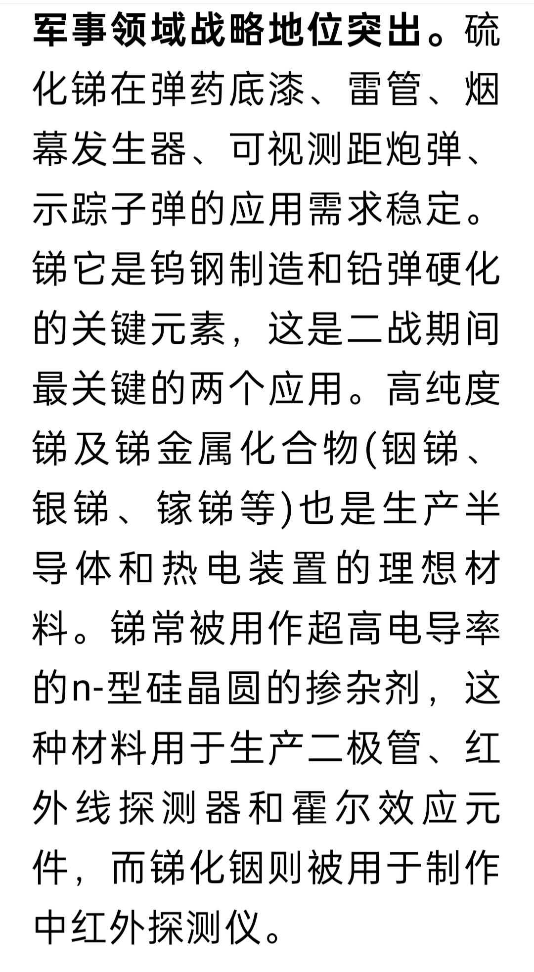 锑具有战略意义,军事武器半导体要用到。中国、美国、欧盟、日本、澳大利亚等均将锑列为关键矿产资源。