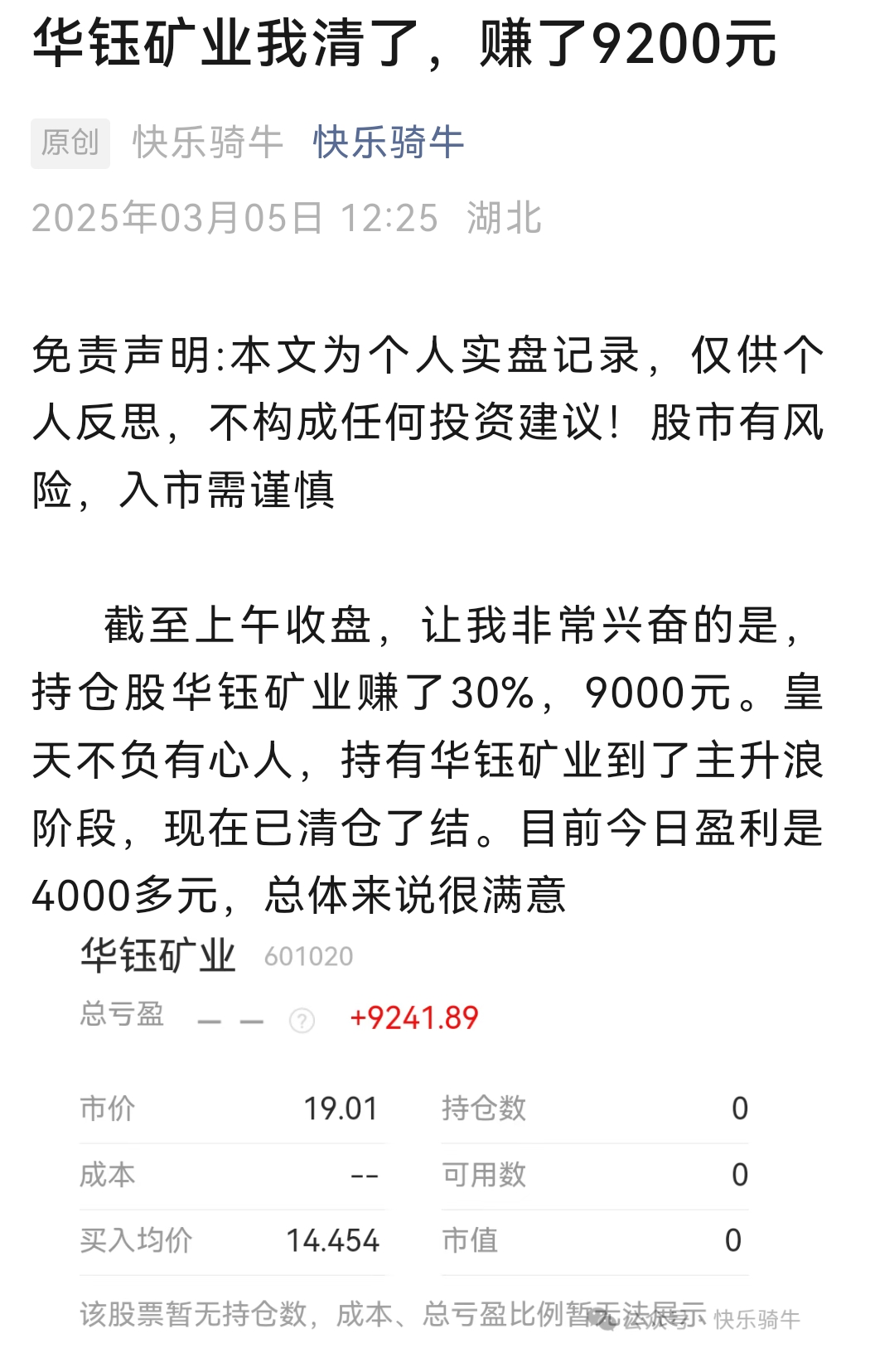 华钰矿业我吃了29个点,估计到了鱼尾行情,我清了。来关注我账户变动呀