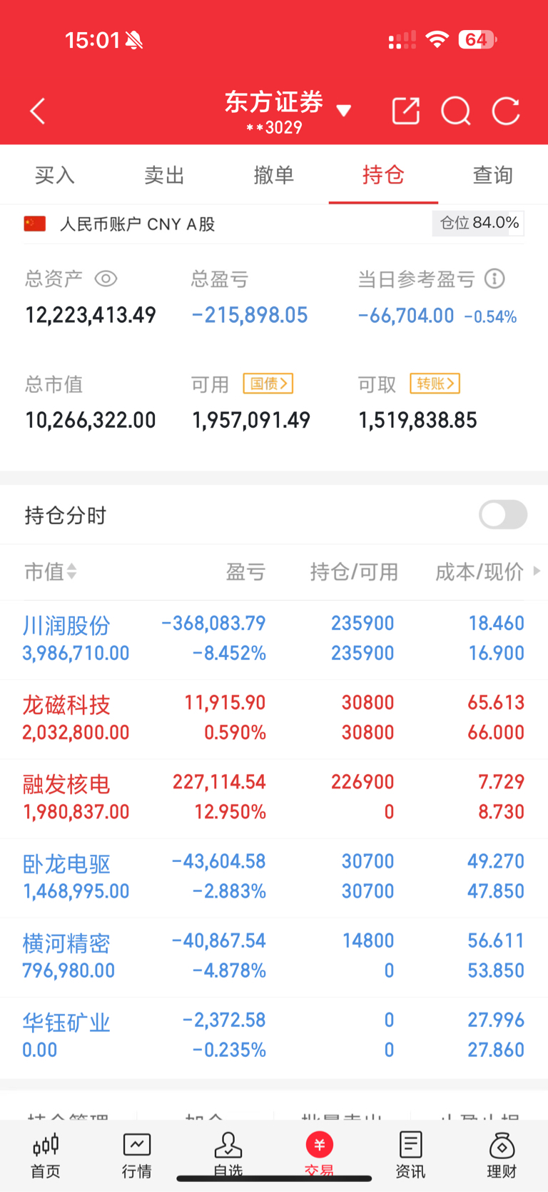 今天就这样粉丝朋友们下周见,目前持有的没啥变动就割肉了$华钰矿业(SH601020)$ 今天新仓$横河精密(SZ300539)$ 亏的我有点难受了,$融发核电(SZ002366)$ 做了T。