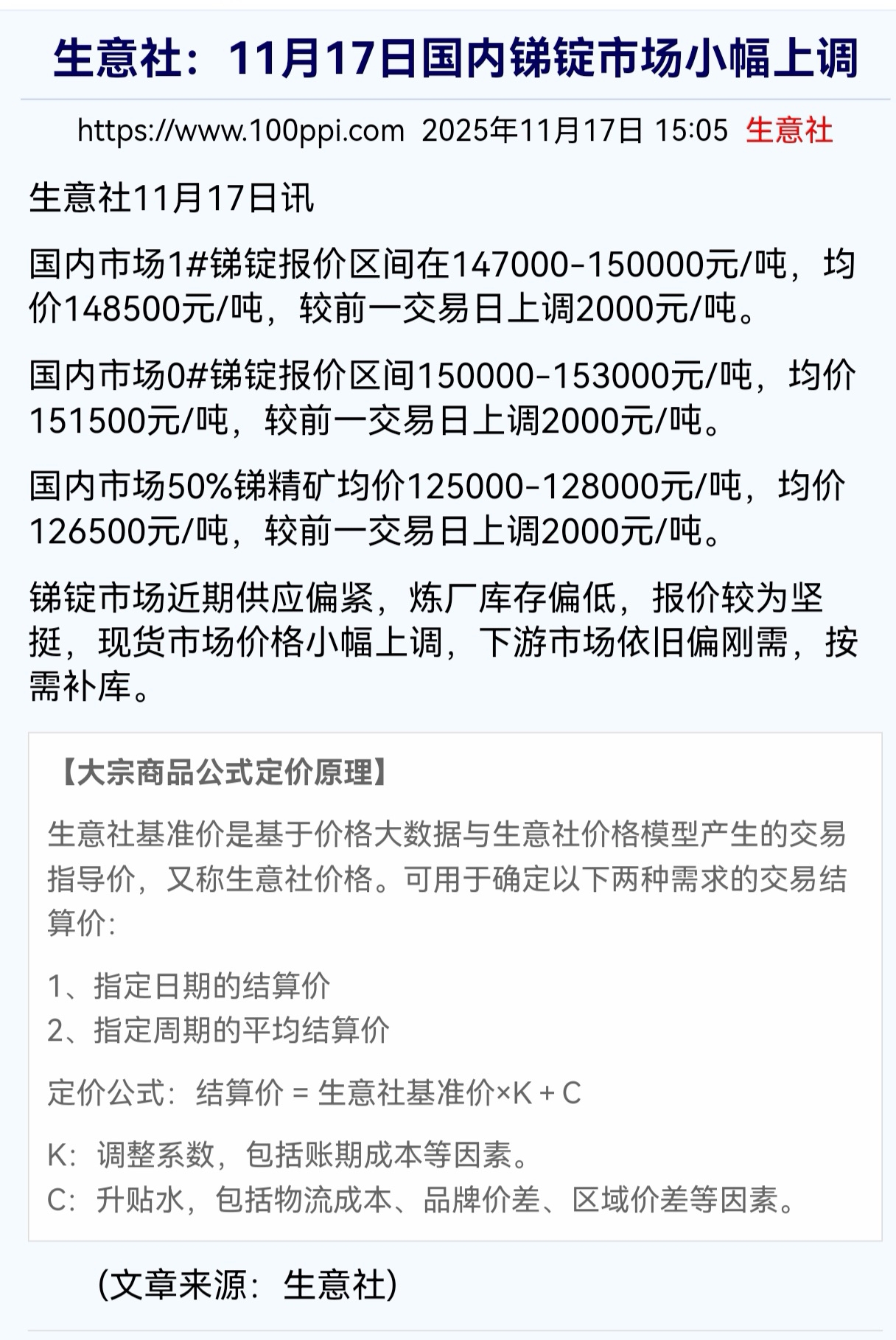 生意社的锑价终于开始动了,临近年底,如果再来几个检修,那么价格将会内外联动。