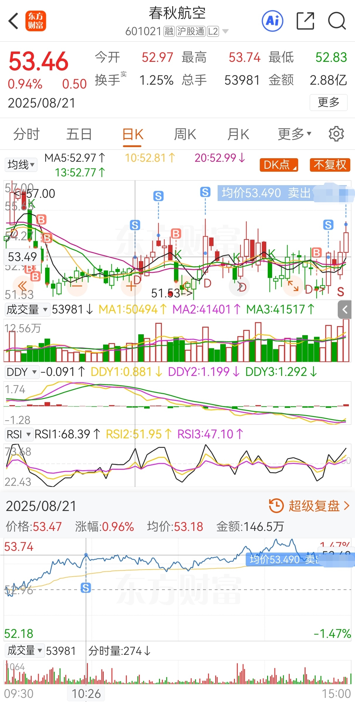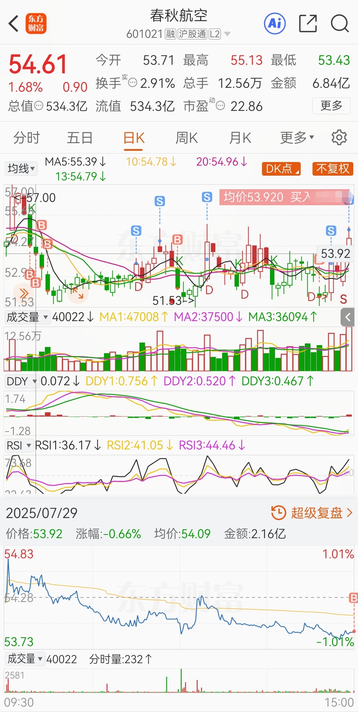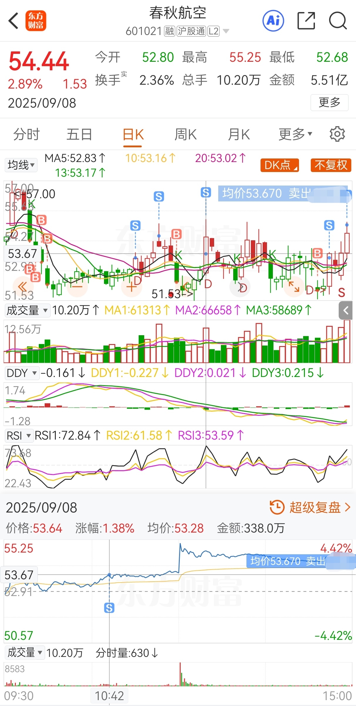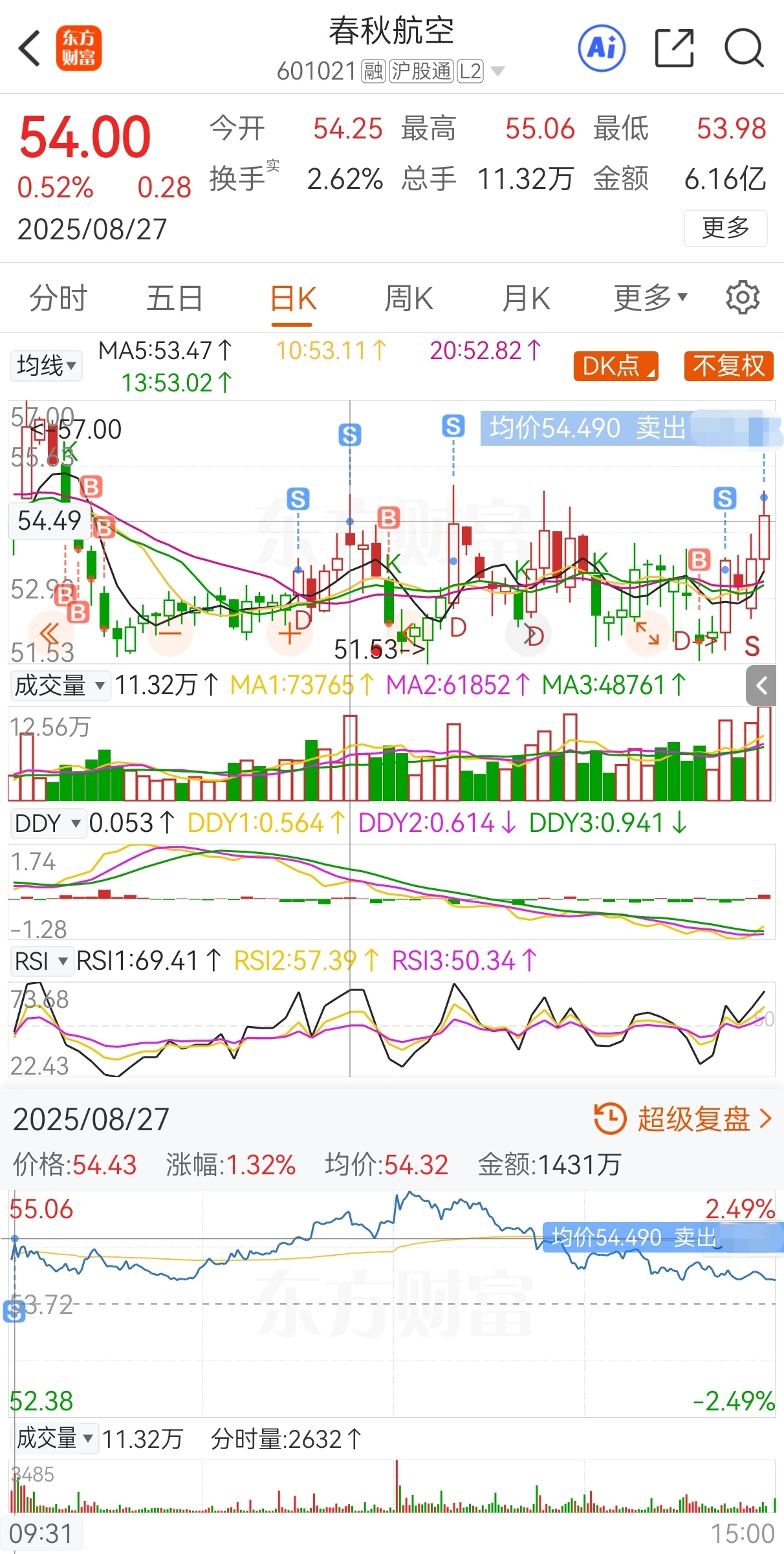 $春秋航空(SH601021)$ 原计划今买明卖,实际54.28买,53.92加仓,53.3再加仓,52.27继续加仓,53.49减仓,54.49再减仓,52.38又加仓,53.67继续减仓,52.01还加仓,53.49又减仓,54.99卖,实盘短线套利春秋航空,成功收米走人!