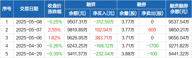 宁波远洋:融资净偿还312.59万元,融资余额9507.31万元(05-08)