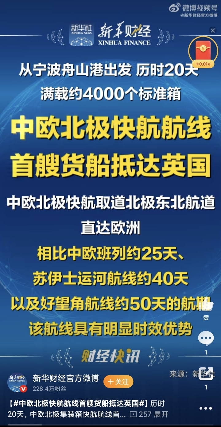 第一班北极航线已安全到达