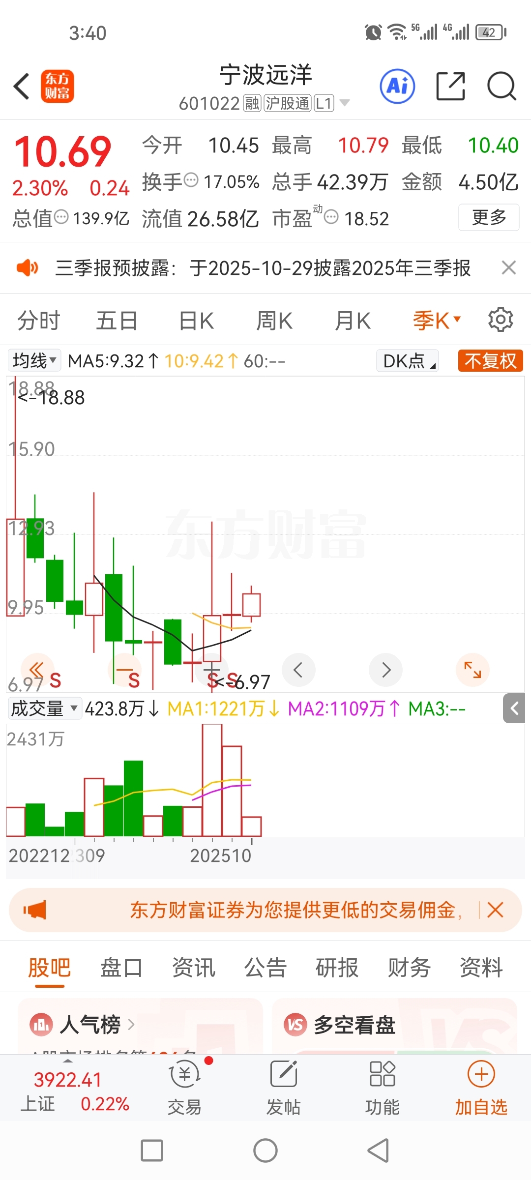 宁波远洋中期图像,三阳开泰型态好,短期形象也不孬,上有18.88把手招,突破前高