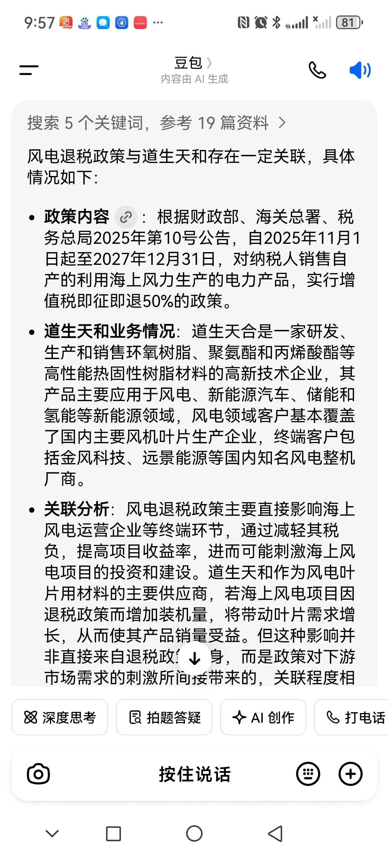 $N道生(SH601026)$ 风电退税政策和道生天合有关联,但是关联性不大,道生天合不在退税范围之内,顶多也就是个间接利好,周一高开就算了,低开建仓!