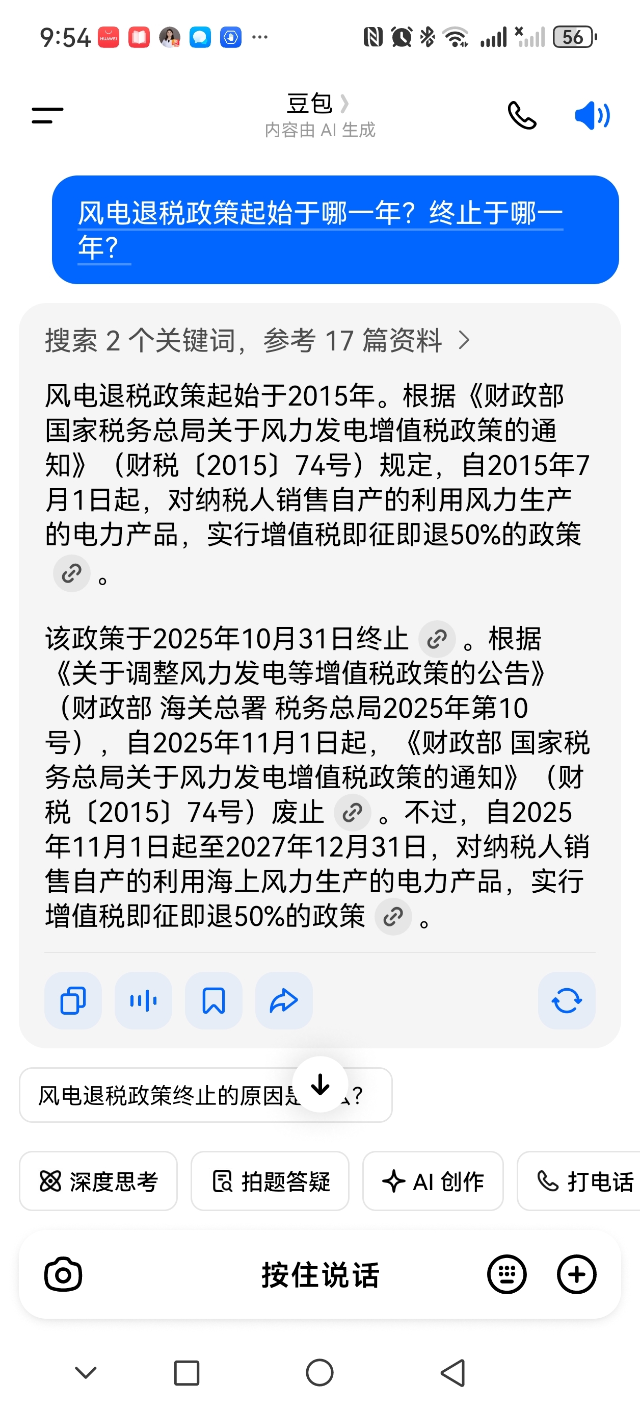 $N道生(SH601026)$ 风电退税政策,其实是重大利空,这个政策其实起始于2015年,前两天的消息只不过对海上风电政策做了个延续,还取消了陆上风电,利空啊!