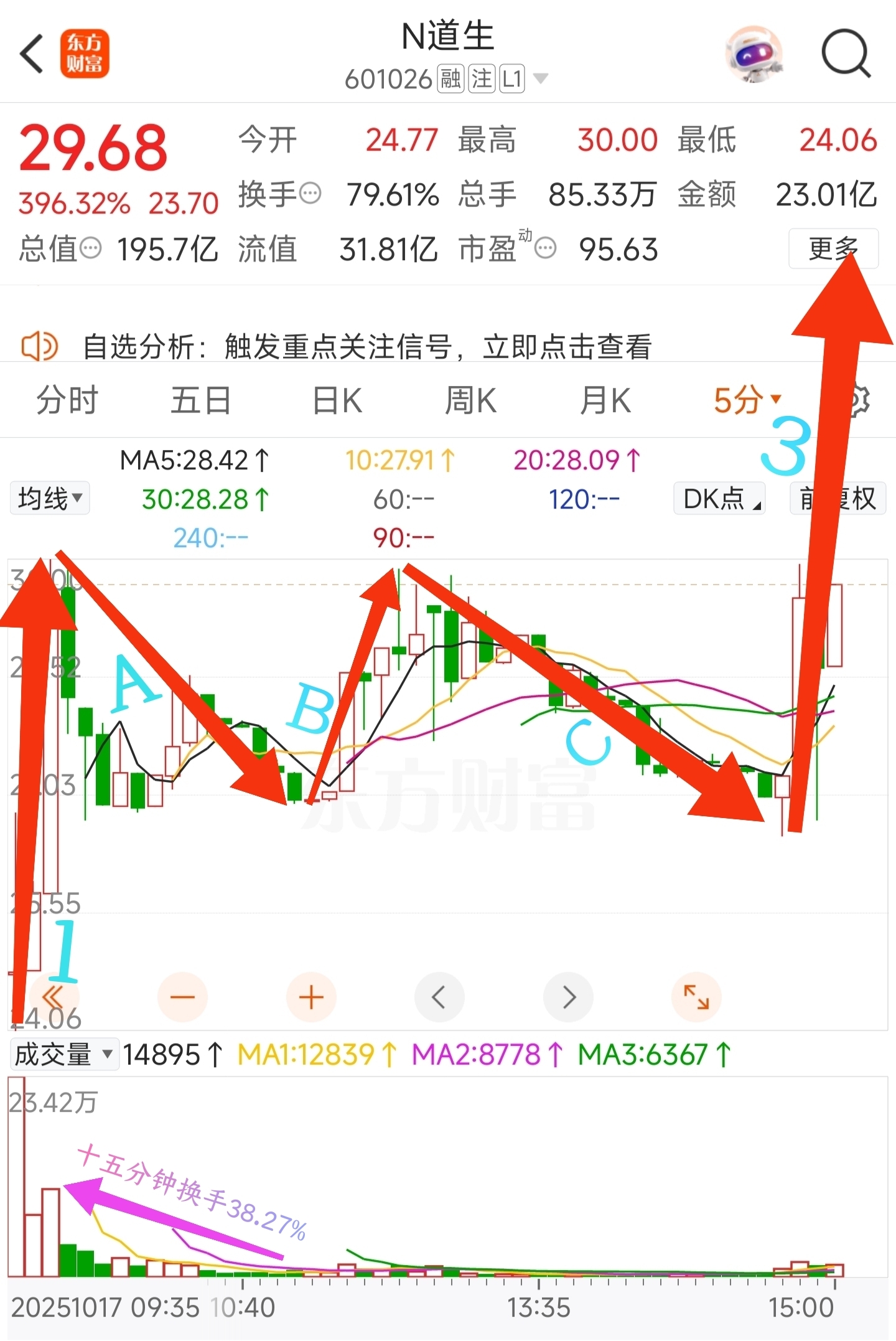 $N道生(SH601026)$ 分时图浪型脉络有序,开盘十五分钟多换手38.27%显然主力资金已强行介入!随后三个多小时构筑平台在此期间时见主动性买盘,收盘前十五分钟点火!仅用一天主力完成了一浪建仓,二浪调整,三浪启动!像新股这种顶尖浪型三浪涨幅为一浪的5.618~35.618倍甚至更神奇的数字!按5.618测算30-24.06=5.94X5.618=33.37+26.51=59.88,按35.618测算30-24.06=5.94X35.618=211.57+26.51=238.08从以上数值得出结论五日内攻击位59.88~238.08明日我仿佛看到漫天飞舞着情绪自由……