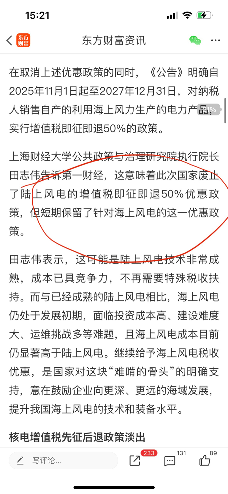 搞半天是原来就风电行业都有百分之50的退税,这次只是短期保留了海上风电的退税,其