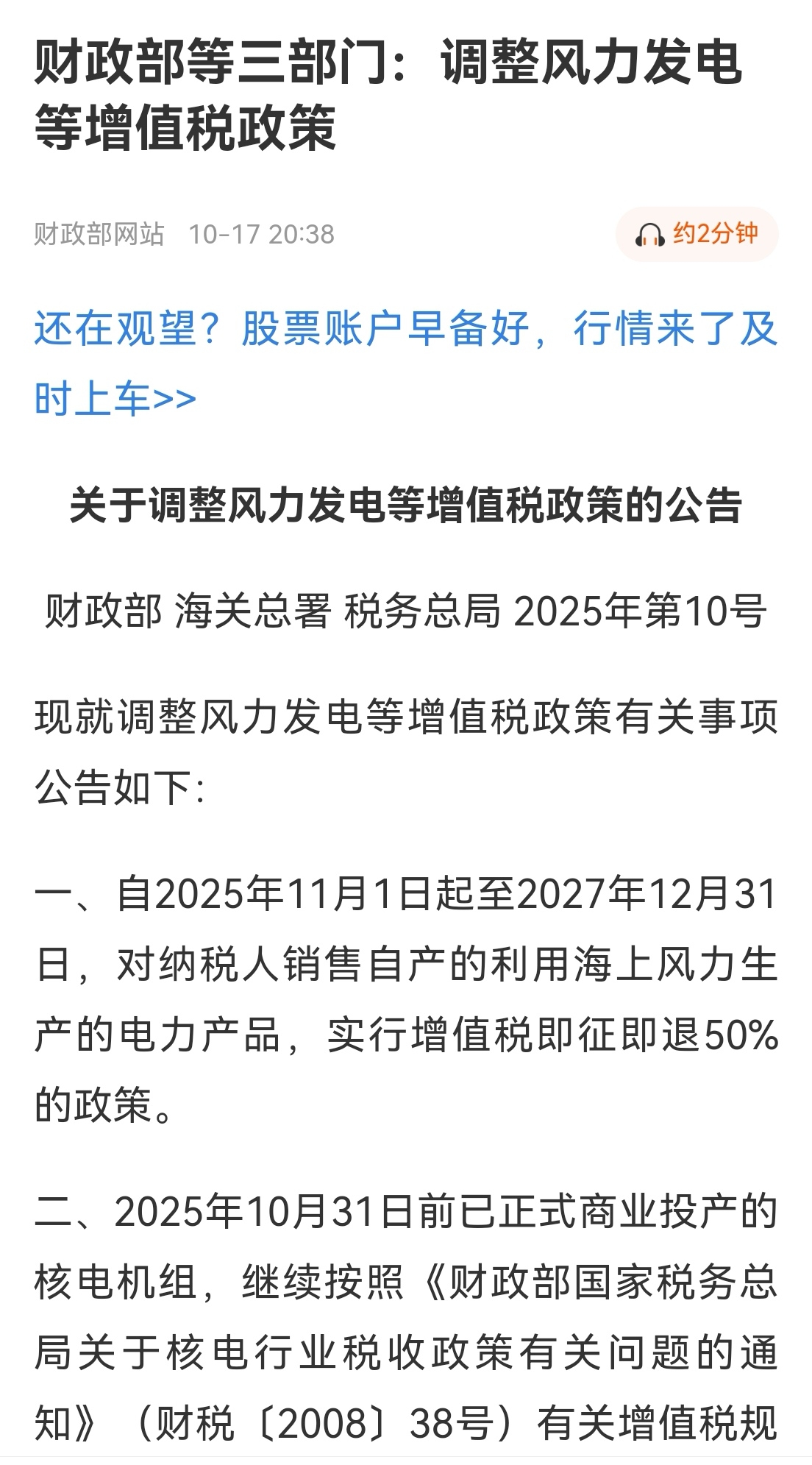 $N道生(SH601026)$ 风能板块出实实在在的利好政策了