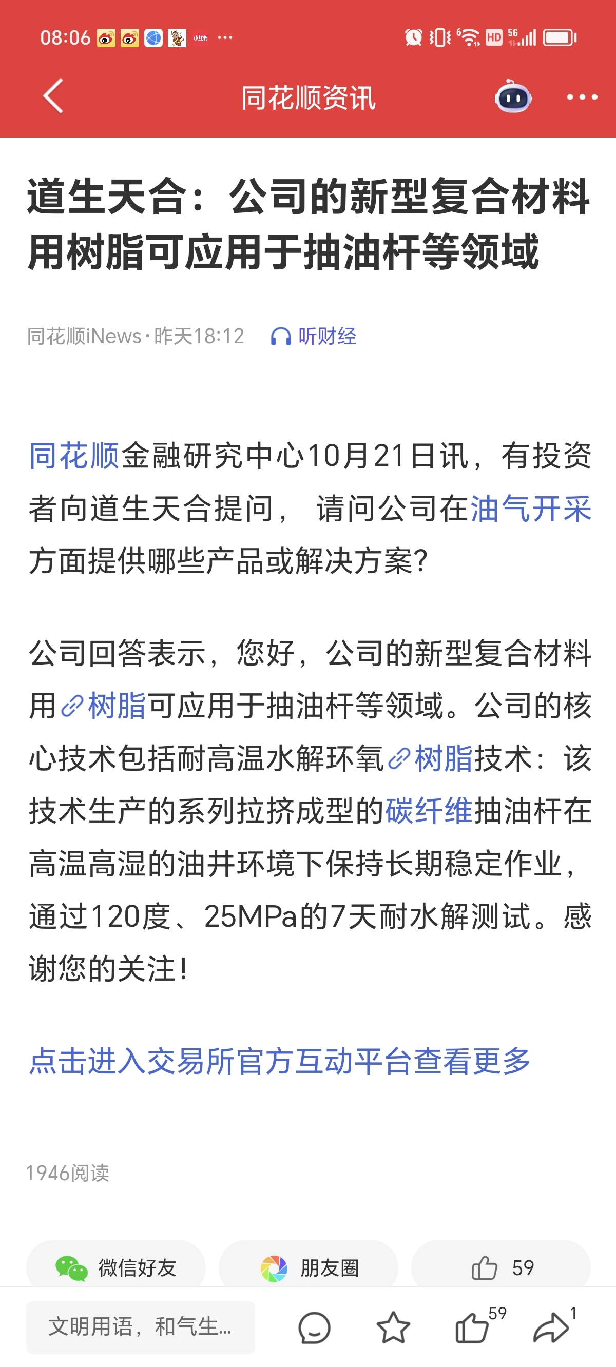 $C道生(SH601026)$ 深地经济刚爆发,硬材料诸如钻石之类的第一时间受到热炒。但事实上,硬材料大多数只应用在钻地工程。由于深地特殊环境,耐高温的轻型新材料才是最需要的。道声天合的新型碳纤维抽油杆,正是新材料在深地经济应用的典型。这不是设想,而是已经有了产品。相关信息在公司简介和董秘回复中都有提及。