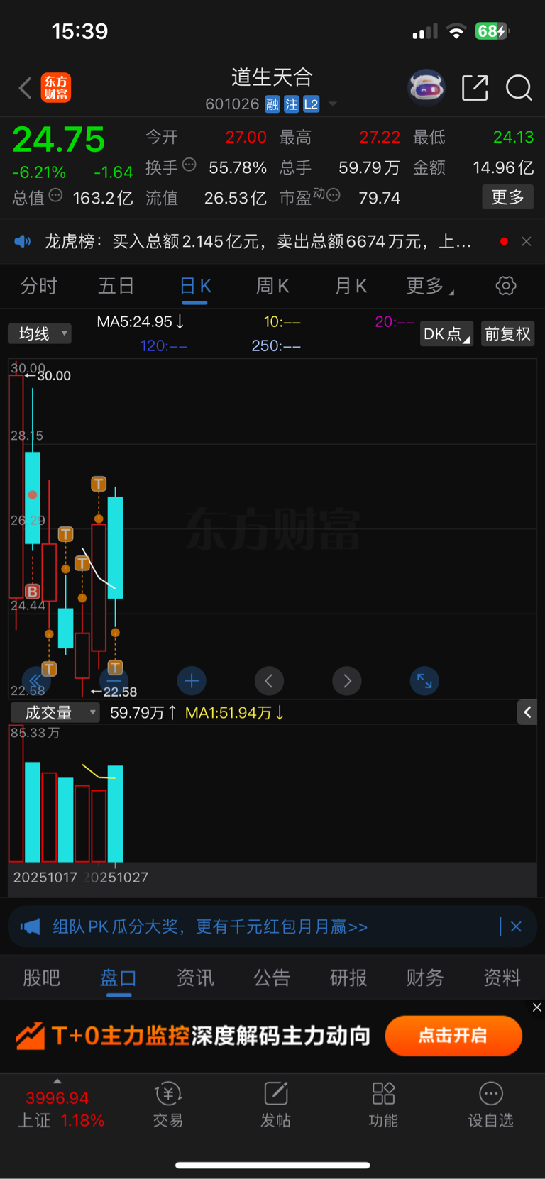 $道生天合(SH601026)$ 没有30我是不会走的,成本越来越低了,砸吧主力