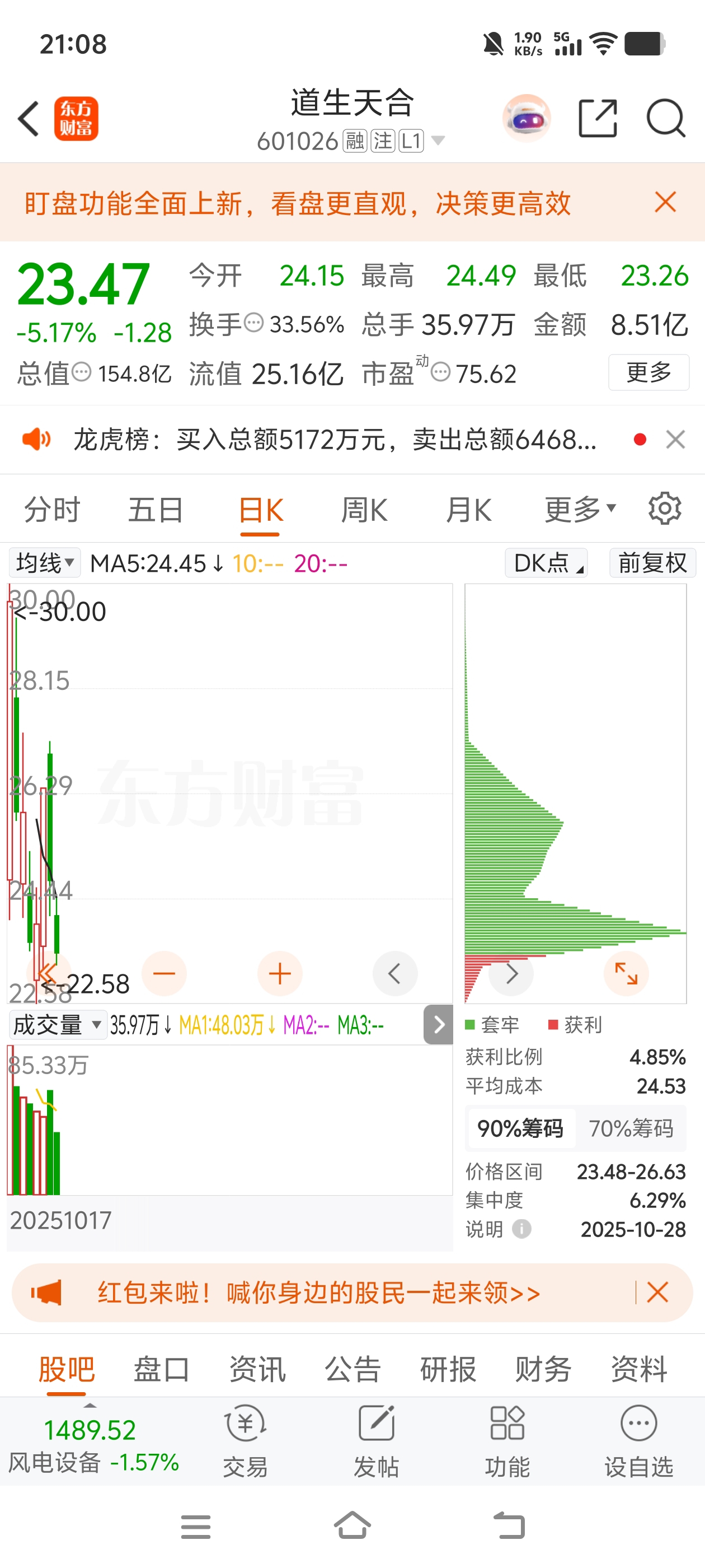 $道生天合(SH601026)$ 实在搞不懂,90%筹码集中度只有6.29%,说明绝大部分筹码集中在一些人手上,而且融资盘也越来越大,换手率每天都很高,不出意外的话,明天融资盘显示又是增加,那么为啥股价却快打到前低22.58价位?新股不至于杀融资盘吧,也没那么快有老庄出现吧?有没有大佬可以指点一下啊?