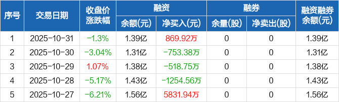 融资方面,当日融资买入3412.1万元,融资偿还2542.19万元,融资净买入869.92万元。融券方面,融券卖出0股,融券偿还0股,融券余量0股,融券余额0元。融资融券余额合计1.39亿元。