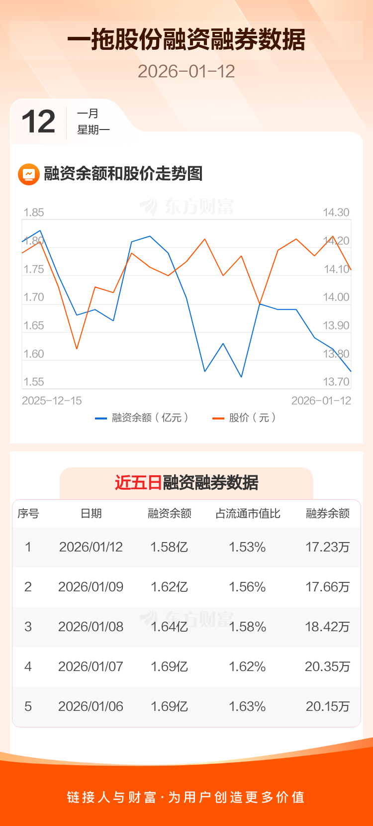交易所最新数据显示,一拖股份于2026年1月12日获融资买入1055.05万元,融资偿还1474.44万元,当日融资净偿还419.38万元。目前,该股融资余额1.58亿,占流通市值比例为1.53%。
