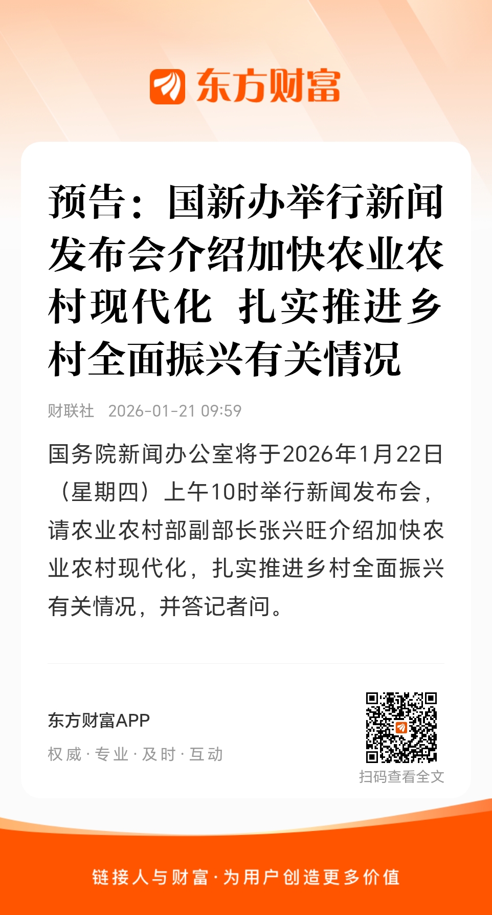 国务院新闻办公室将于2026年1月22日(星期四)上午10时举行新闻发布会,请农业农村部副部长张兴旺介绍加快农业农村现代化,扎实推进乡村全面振兴有关情况,并答记者问。