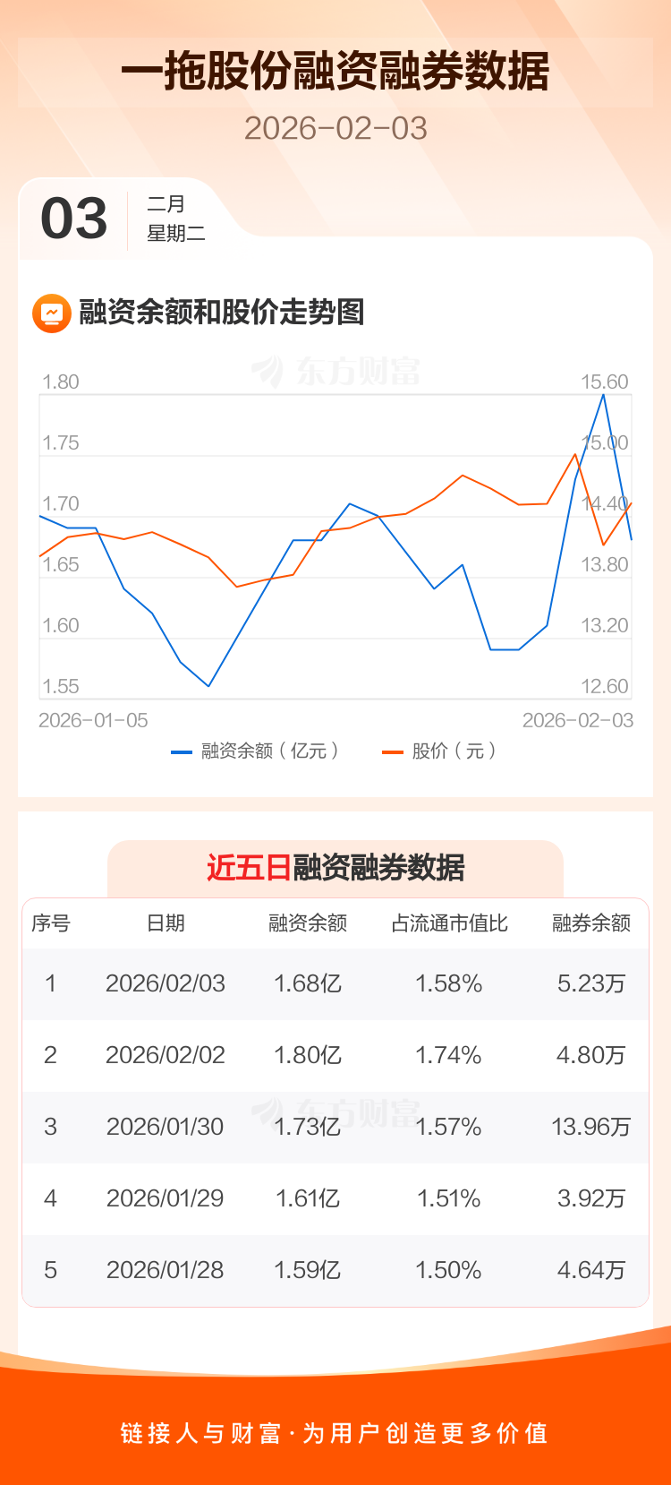 交易所最新数据显示,一拖股份于2026年2月3日获融资买入1021.41万元,融资偿还2186.94万元,当日融资净偿还1165.53万元。目前,该股融资余额1.68亿,占流通市值比例为1.58%。