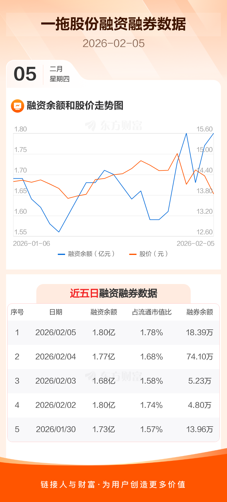 交易所最新数据显示,一拖股份于2026年2月5日获融资买入2628.51万元,融资偿还2288.36万元,当日融资净买入340.16万元。目前,该股融资余额1.80亿,占流通市值比例为1.78%。