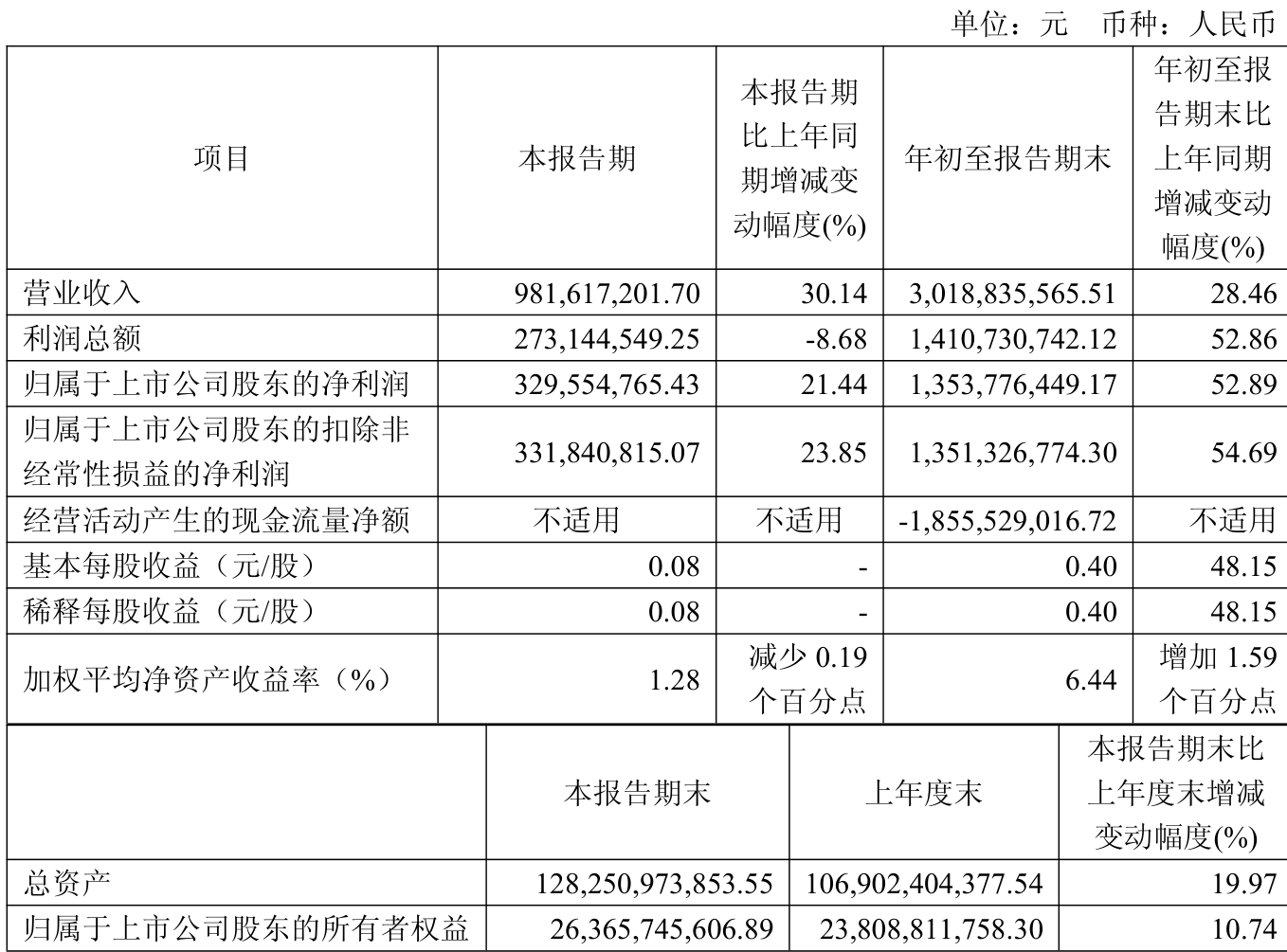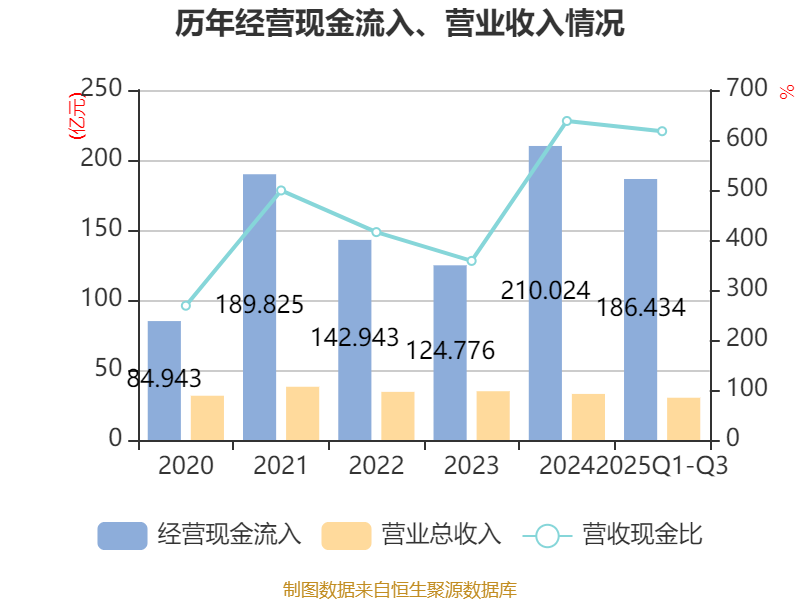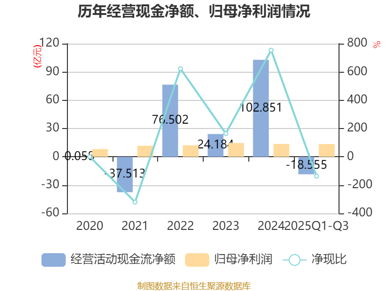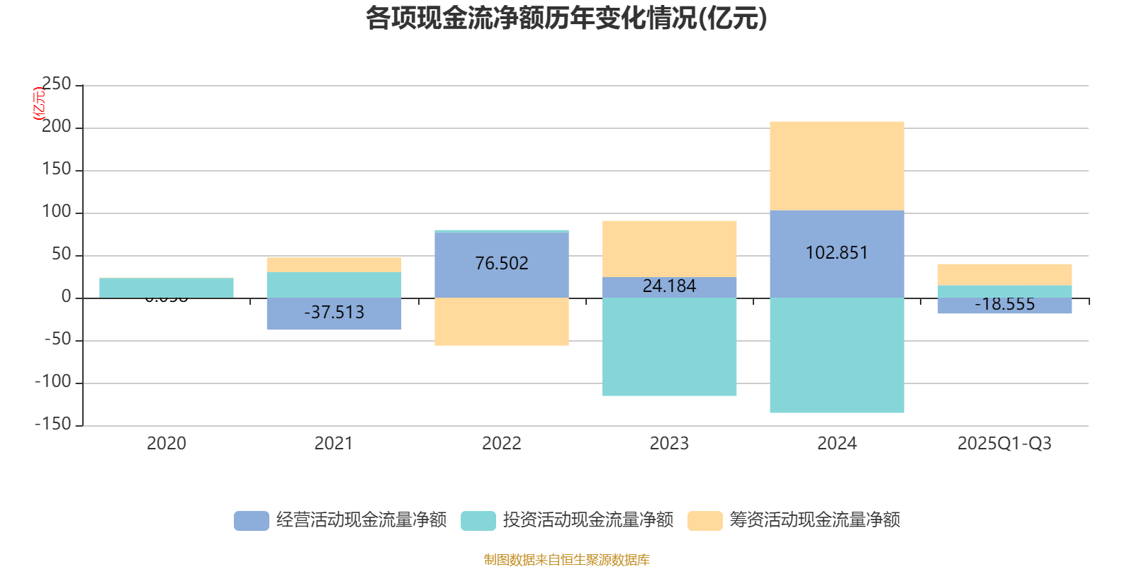 2025年前三季度,公司经营活动现金流净额为-18.56亿元,同比减少55.76亿元;筹资活动现金流净额24.7亿元,同比增加22.6亿元;投资活动现金流净额14.69亿元,上年同期为1.18亿元。