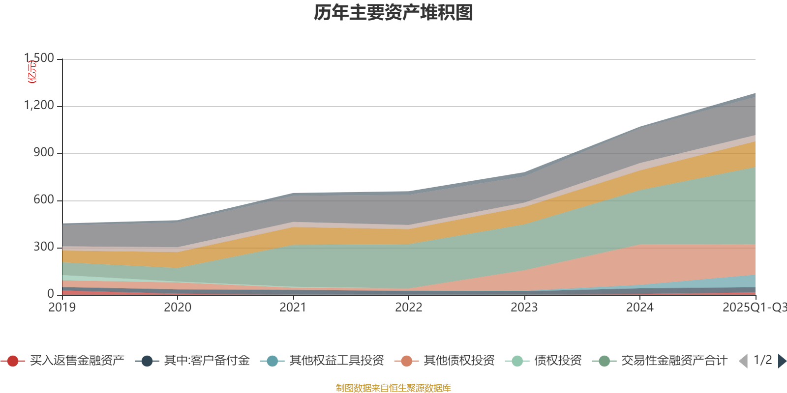 资产重大变化方面,截至2025年三季度末,公司其他债权投资较上年末减少24.83%,占公司总资产比重下降9.01个百分点;交易性金融资产合计较上年末增加42.71%,占公司总资产比重上升6.11个百分点;其他权益工具投资较上年末增加263.47%,占公司总资产比重上升4.14个百分点;货币资金较上年末增加9.78%,占公司总资产比重下降1.76个百分点。