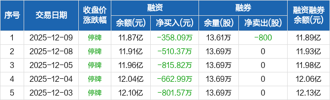 融资方面,当日融资买入0元,融资偿还358.09万元,融资净偿还358.09万元,连续14日净偿还累计1.04亿元。融券方面,融券卖出0股,融券偿还800股,融券余量13.61万股,融券余额242.12万元。融资融券余额合计11.89亿元。