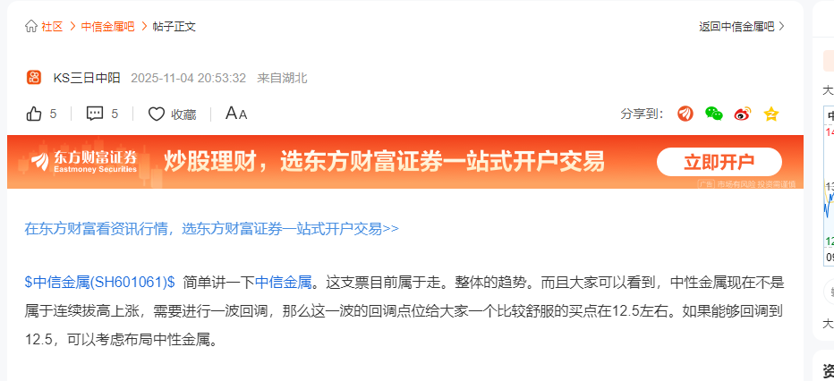 拒绝马后炮 拒绝,自己请看往期帖子,硬黑的狗笼子伺候哈,目前和中信金属并且强势股票还有中孚实业和常铝股份,整体走势都是非常强势的