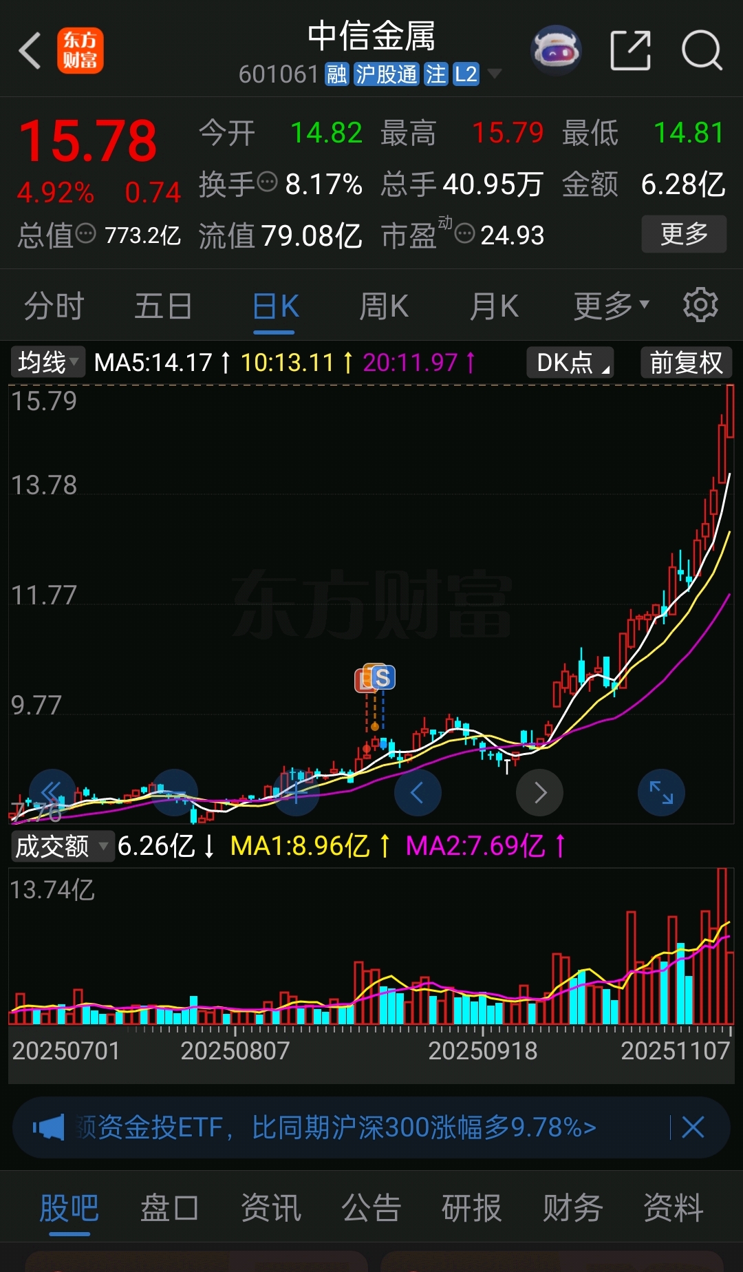 $中信金属(SH601061)$ 好久不看都涨这么多了