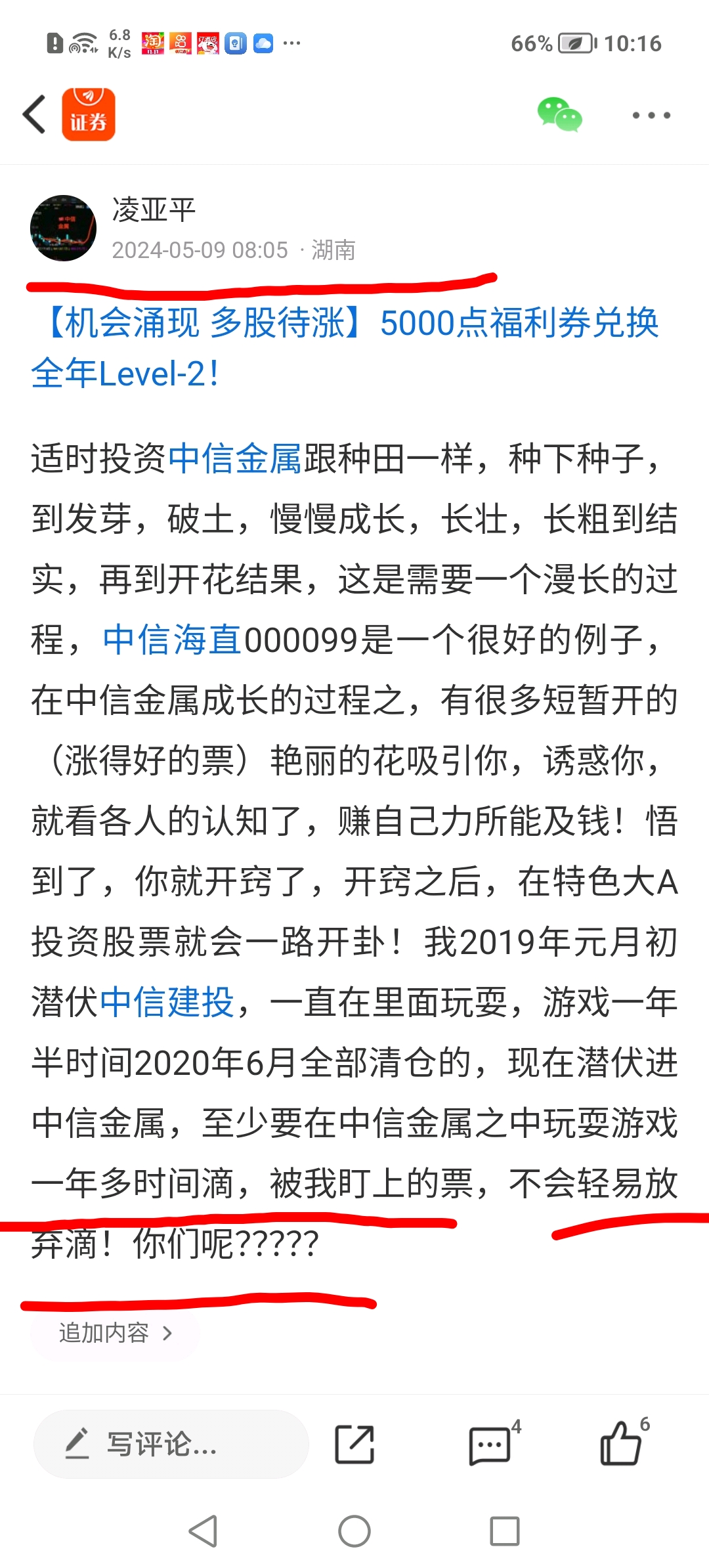 $中信金属(SH601061)$ 跟我在底部买入煎熬的几百号铁粉们你们好!特别提示,重点提示!开启越涨,越卖,减仓模式了!不再提示!凌亚平