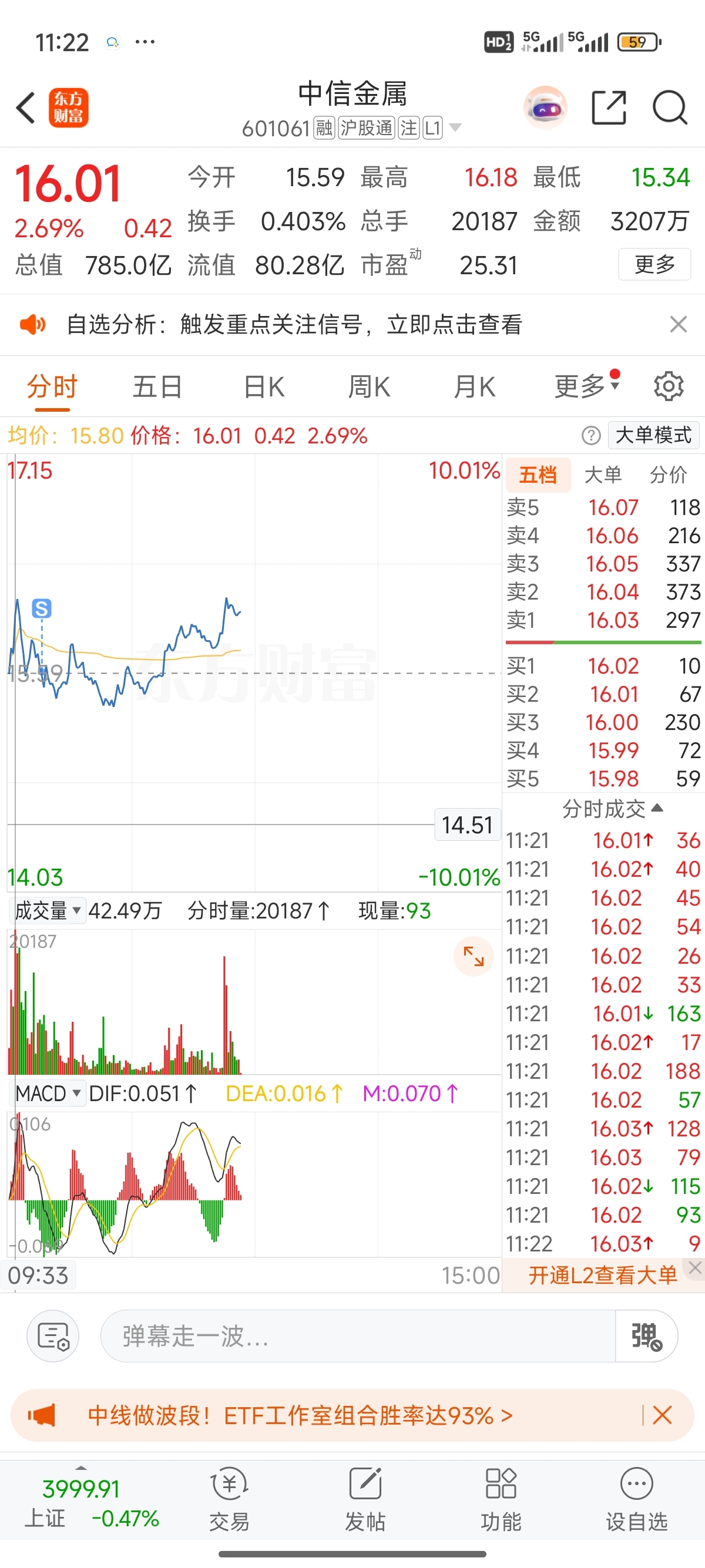 $中信金属(SH601061)$ 早上一波比一波低,现在拉回来了哎