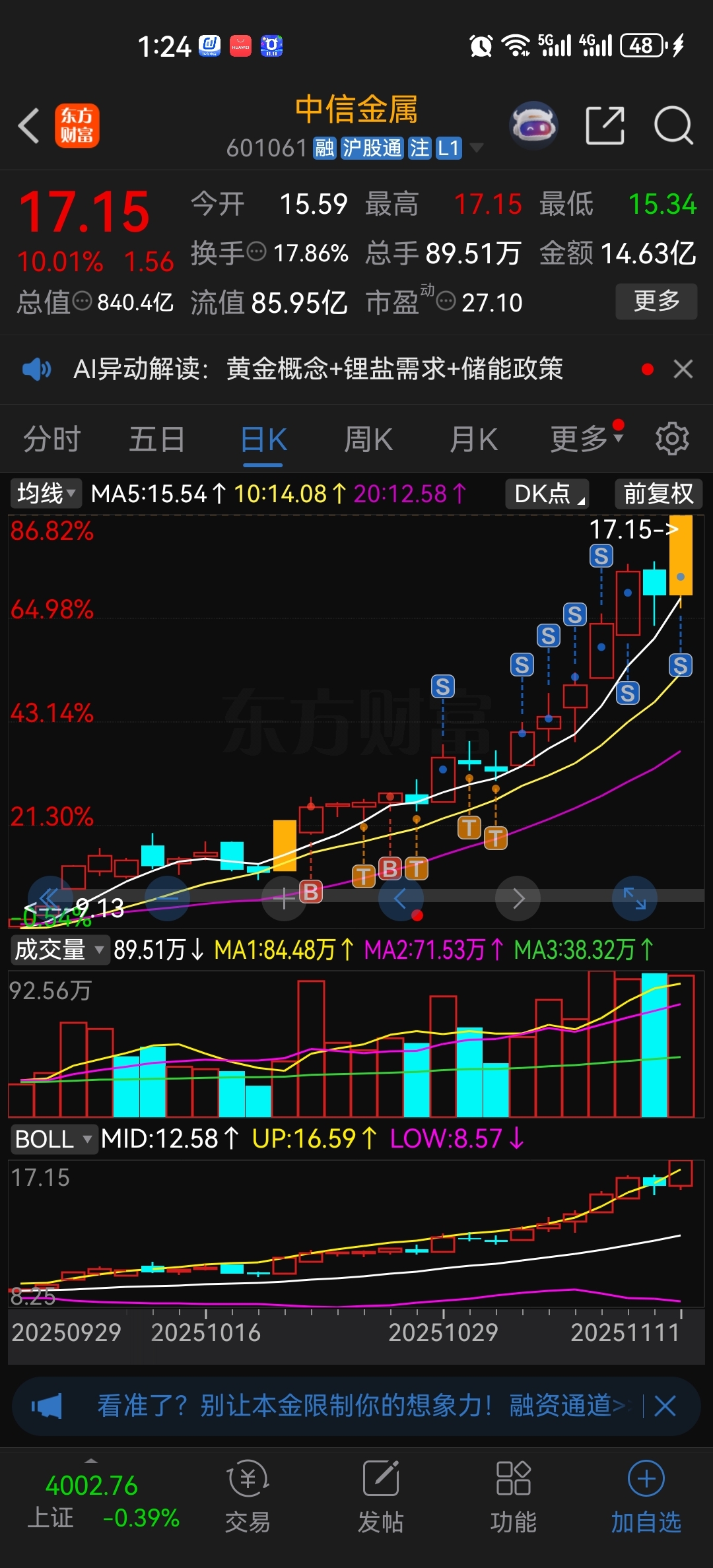 $中信金属(SH601061)$ 这一波结实了,等待调整了