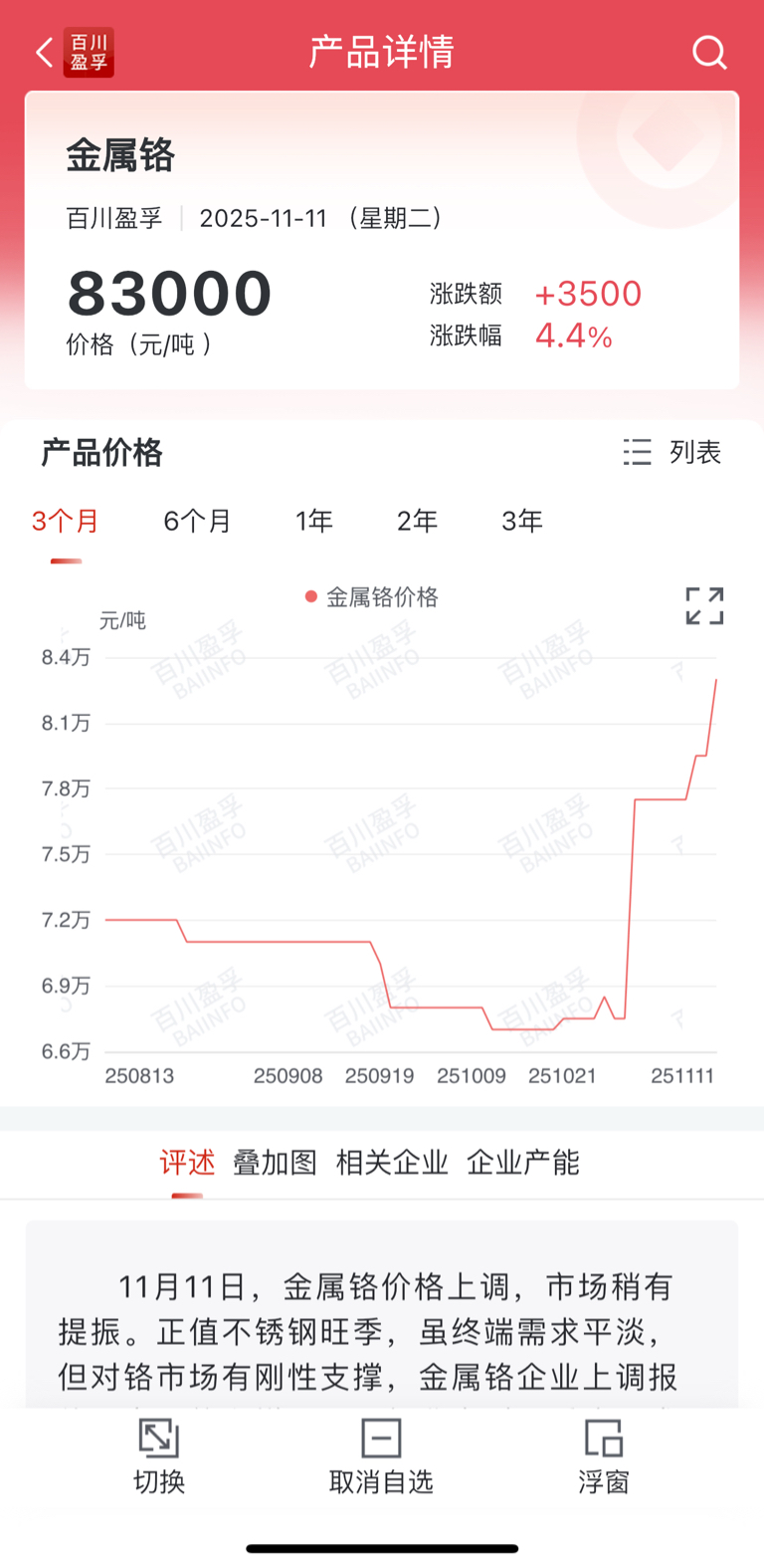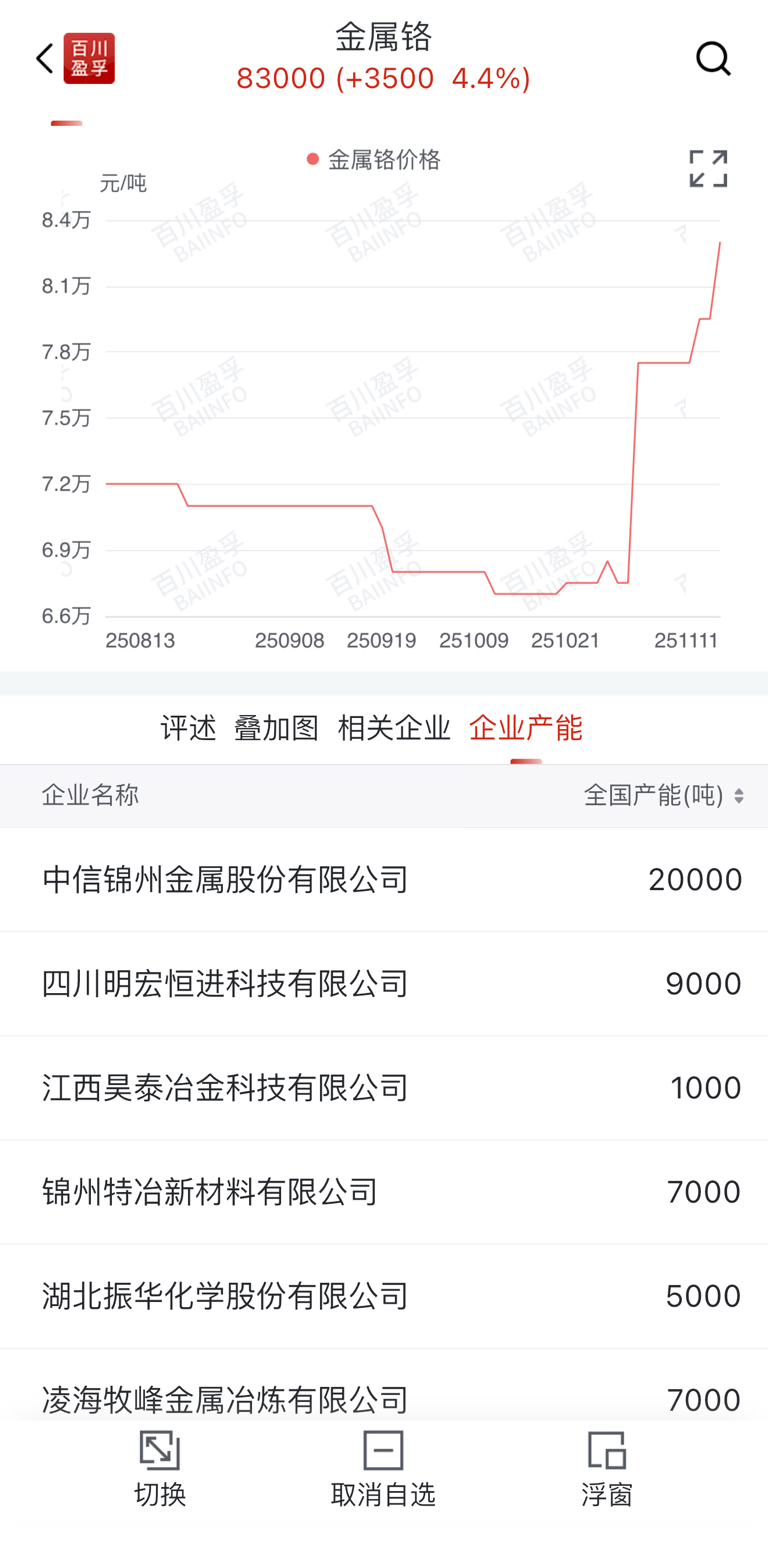 金属铬今日涨价3500元/吨,单日涨幅4.4%,企业产能中信锦州产能国内第一!