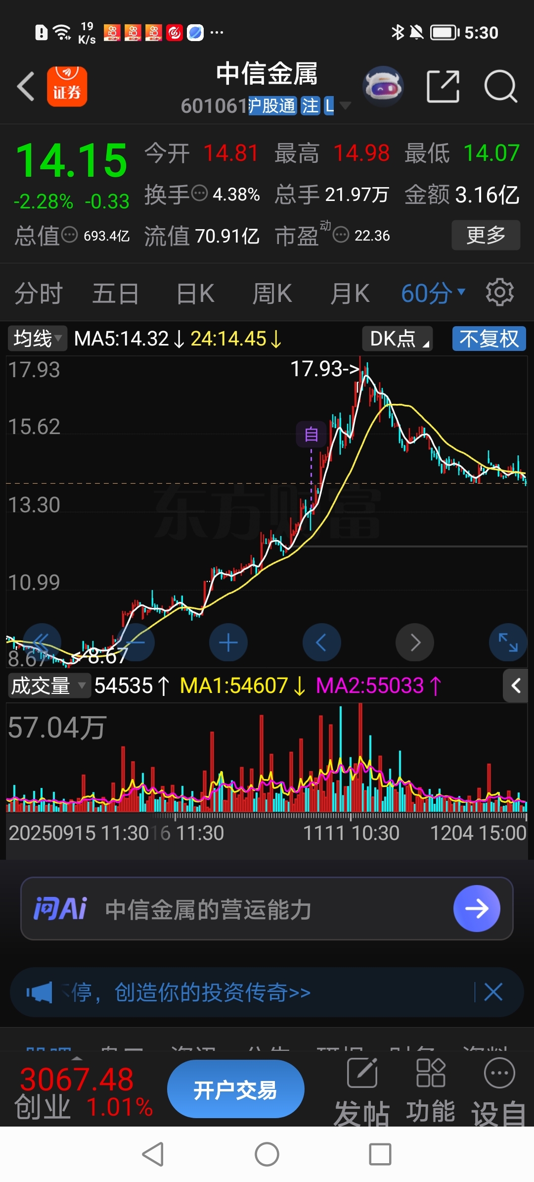 $中信金属(SH601061)$ 咱们进场只有3O亿流通市值!从17块9回调到14块附近还有7O亿流通市值!即使未来会涨到20元、30元、60元!目前我没有看到可以进场的信号!那就让中信金属继续温水煮青蛙阴跌吧