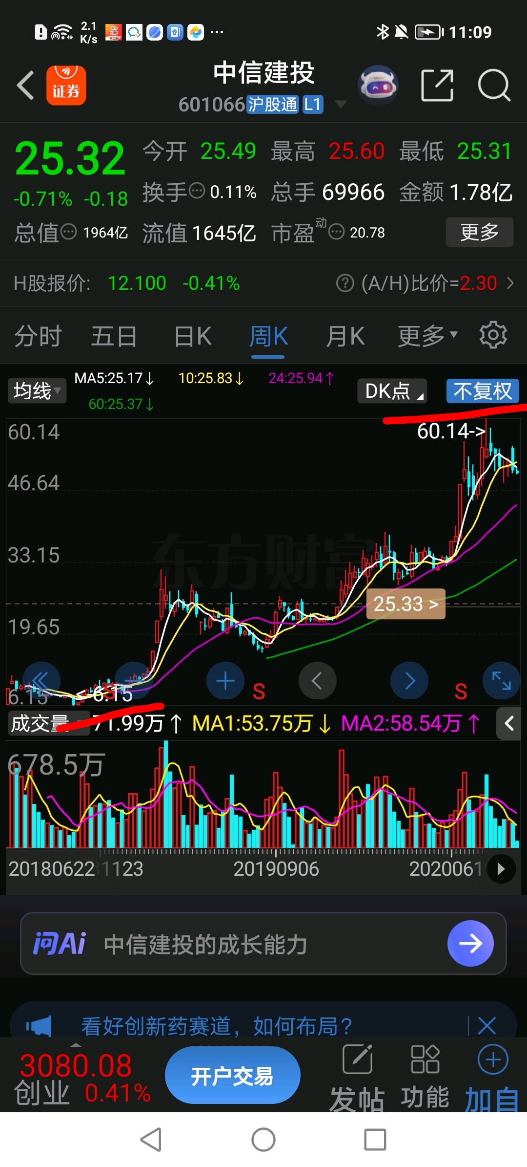 中信建投从6块多涨到6O元见顶!中信金属从6块多开始上涨也会涨到6O元!不可能就