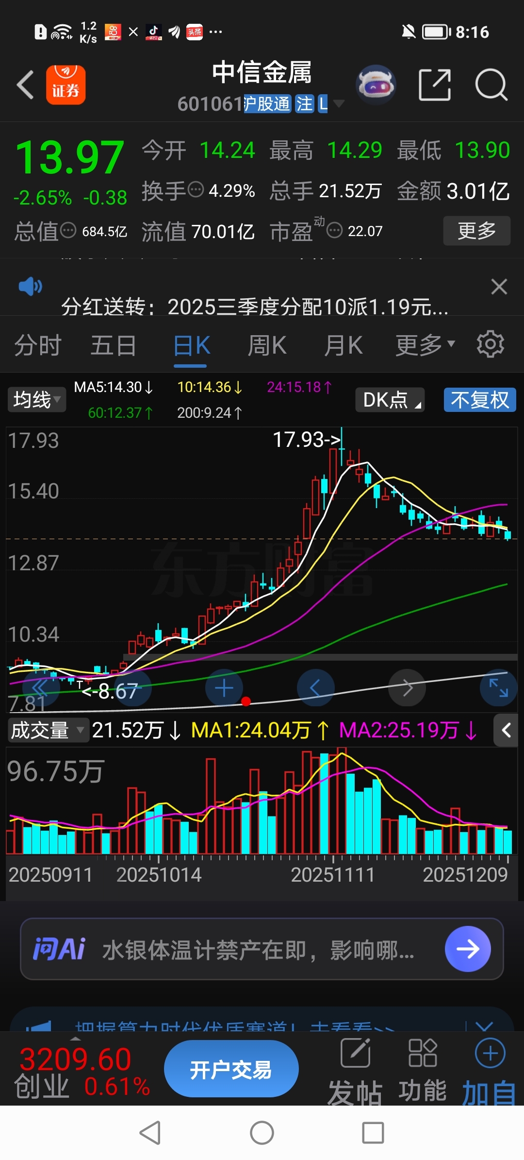 $中信金属(SH601061)$ 纯技术分析:日k从17块9毛3见顶之后一路回调、中间有三次微少反抽修复动作!目前来看技术性离60均线还有一块多距离!接下来的N天交易运行!60天均价随股价振荡向下运行!60天均价会有所抬高!仅此而已!不预测什么时间、什么价格会跌到60天均线!更不会麻木判断6o天均线会不会止跌!预测这东西一点都不靠谱!市场是走出来的!耐心等待继续看戏!