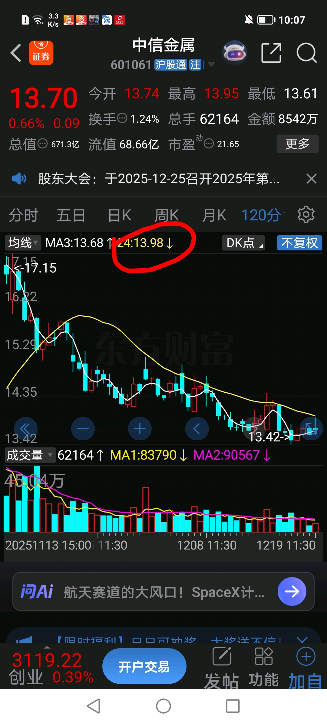 今天中信金属不错是回撤趋势中第五次冲击阻力线黄线附近!夸夸中信金属