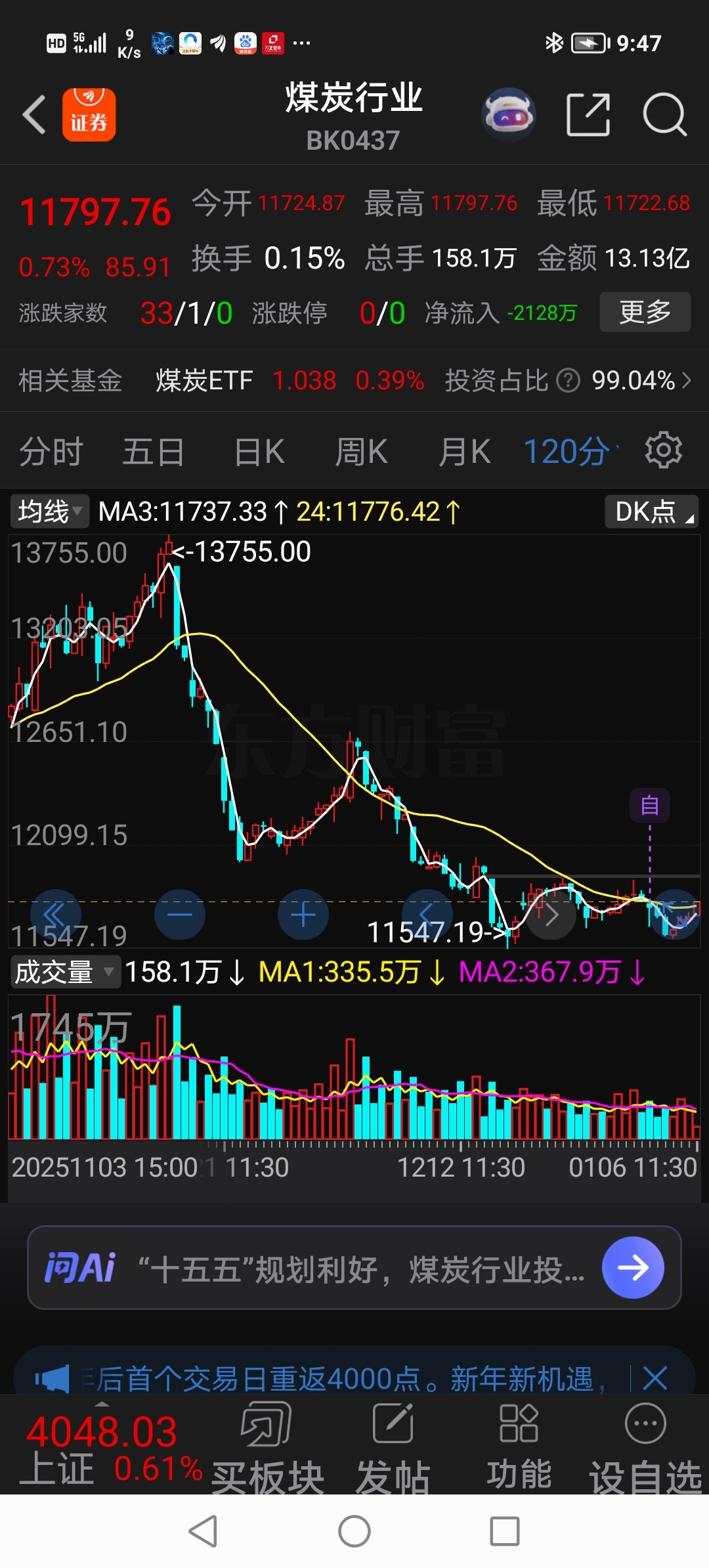 还记得凌亚平把煤炭板块加入自选股之中吗?是不是黄线开始走平、白线将要上穿黄线了?