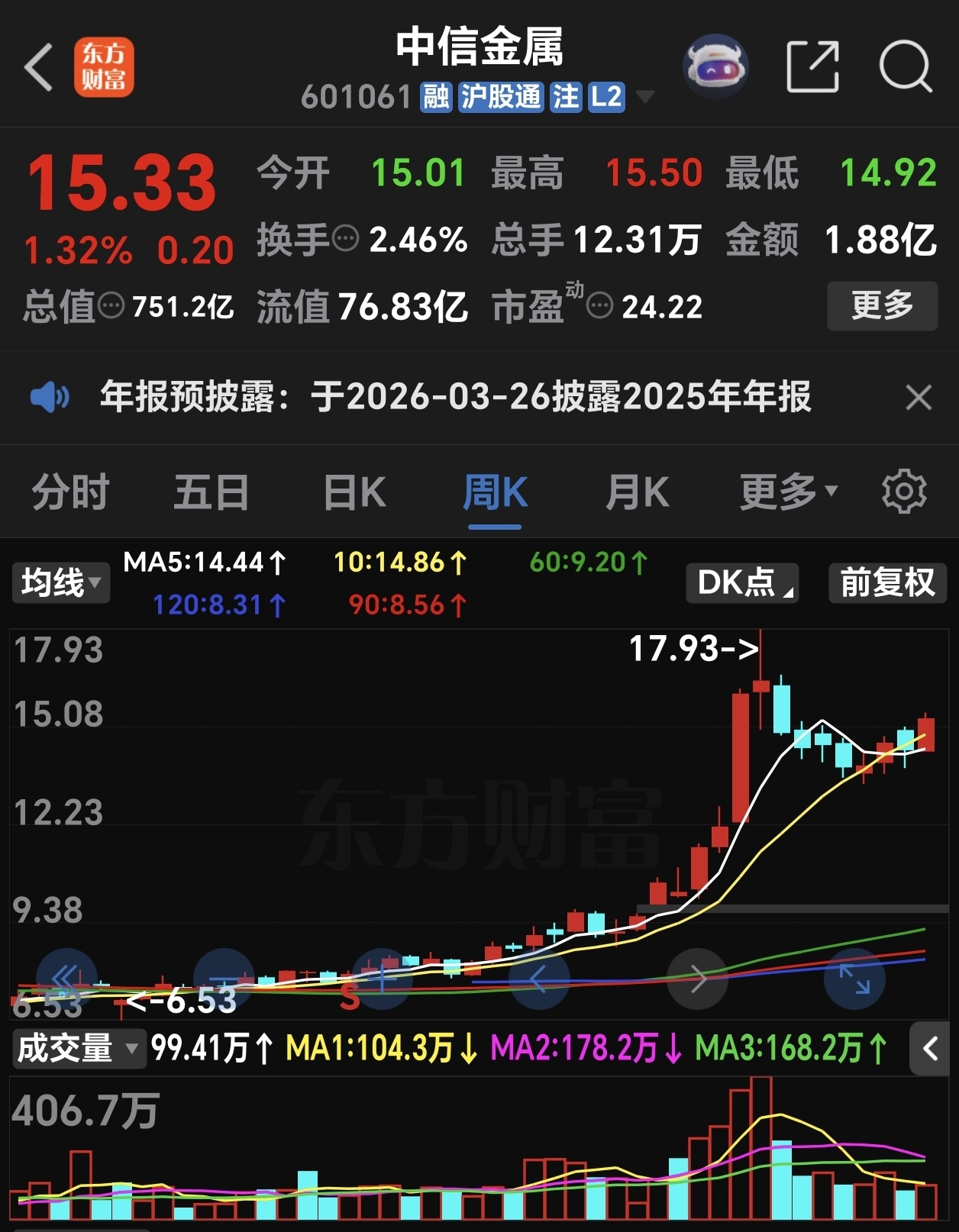 $中信金属(SH601061)$ 调整九周了,时间空间都差不多吧!下周能放量形成周线鸭头突破吗?