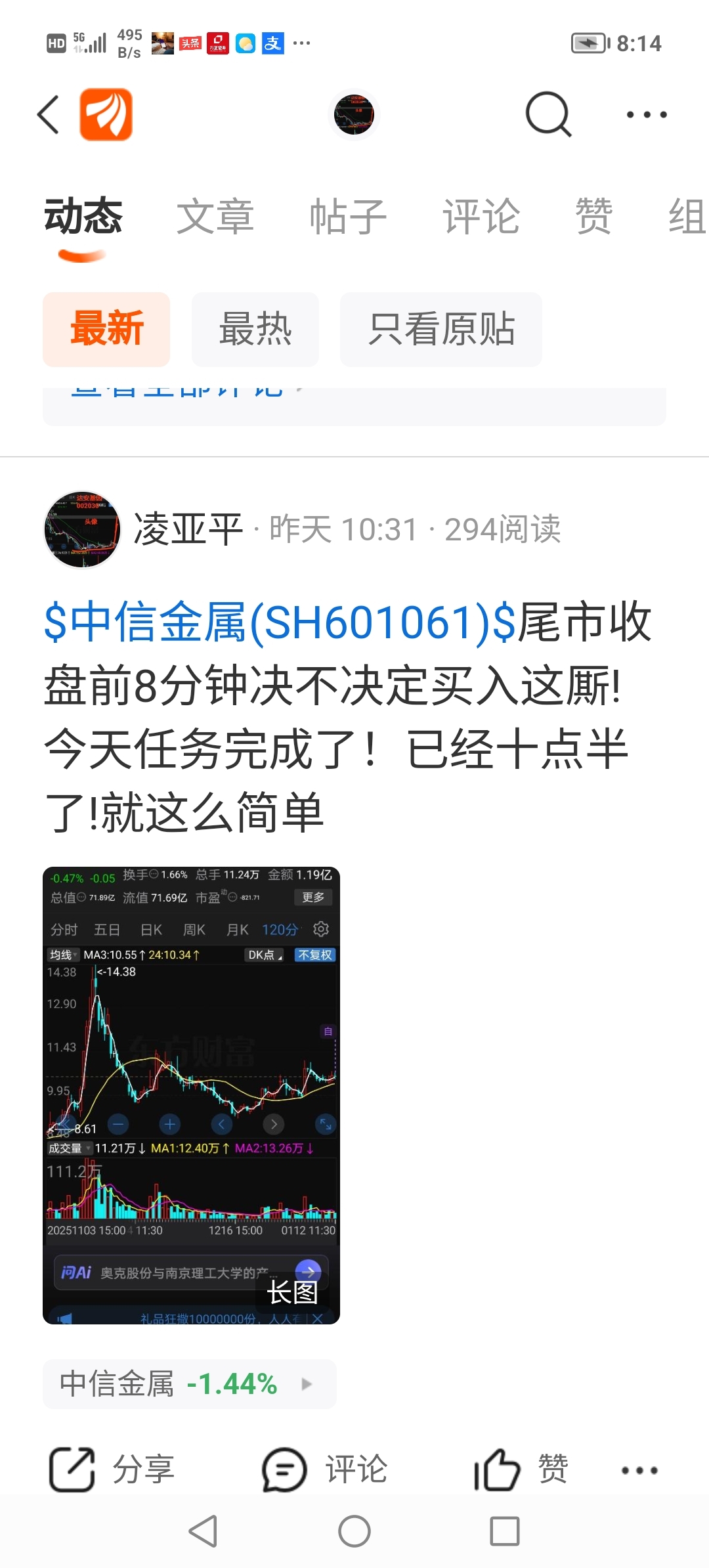 $中信金属(SH601061)$ 我是一个真诚的人!昨天买了共计五只票、都是买在黄线趋势上的!玩股票我比较花心、喜欢布局在黄线趋势上的票N只、以便隔三差五都有高抛的机会!大家不要学我花心哦!