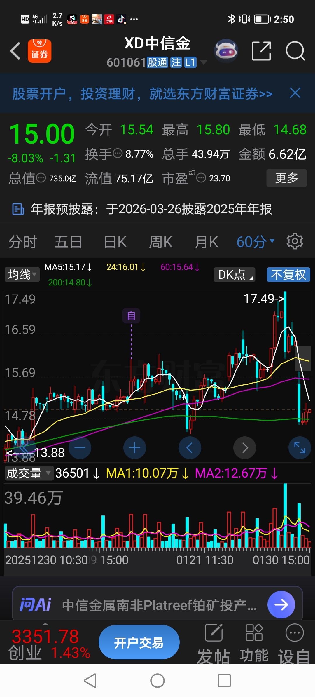 $XD中信金(SH601061)$ 收盘点评:恭喜贺喜今天在早盘跌停价14块6毛8跟我捡筹码的、下周有有几个点收益就跑.知足常乐哦