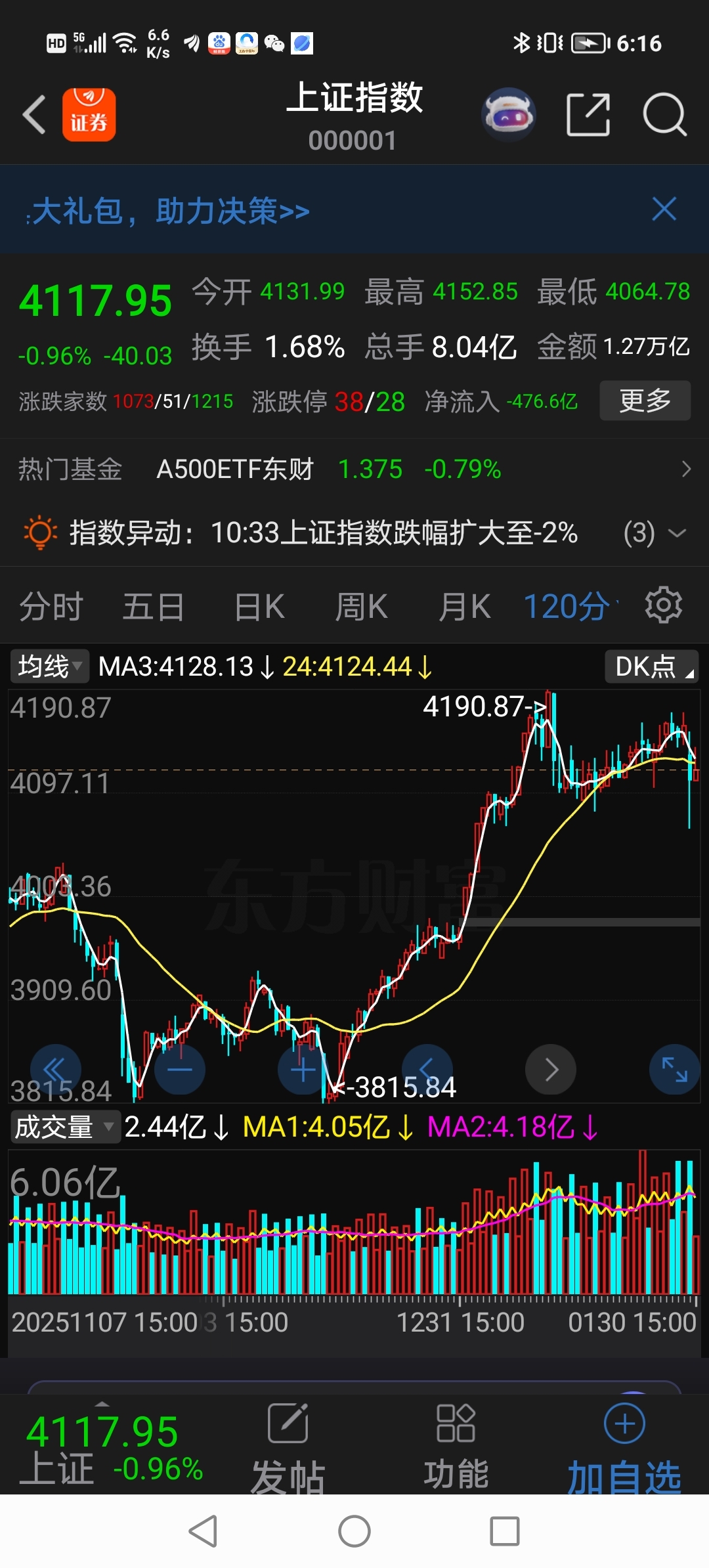 大盘黄线趋势在小山峰横盘N个120分钟k线组合、积聚不小风险、下周如果小跌或阴跌