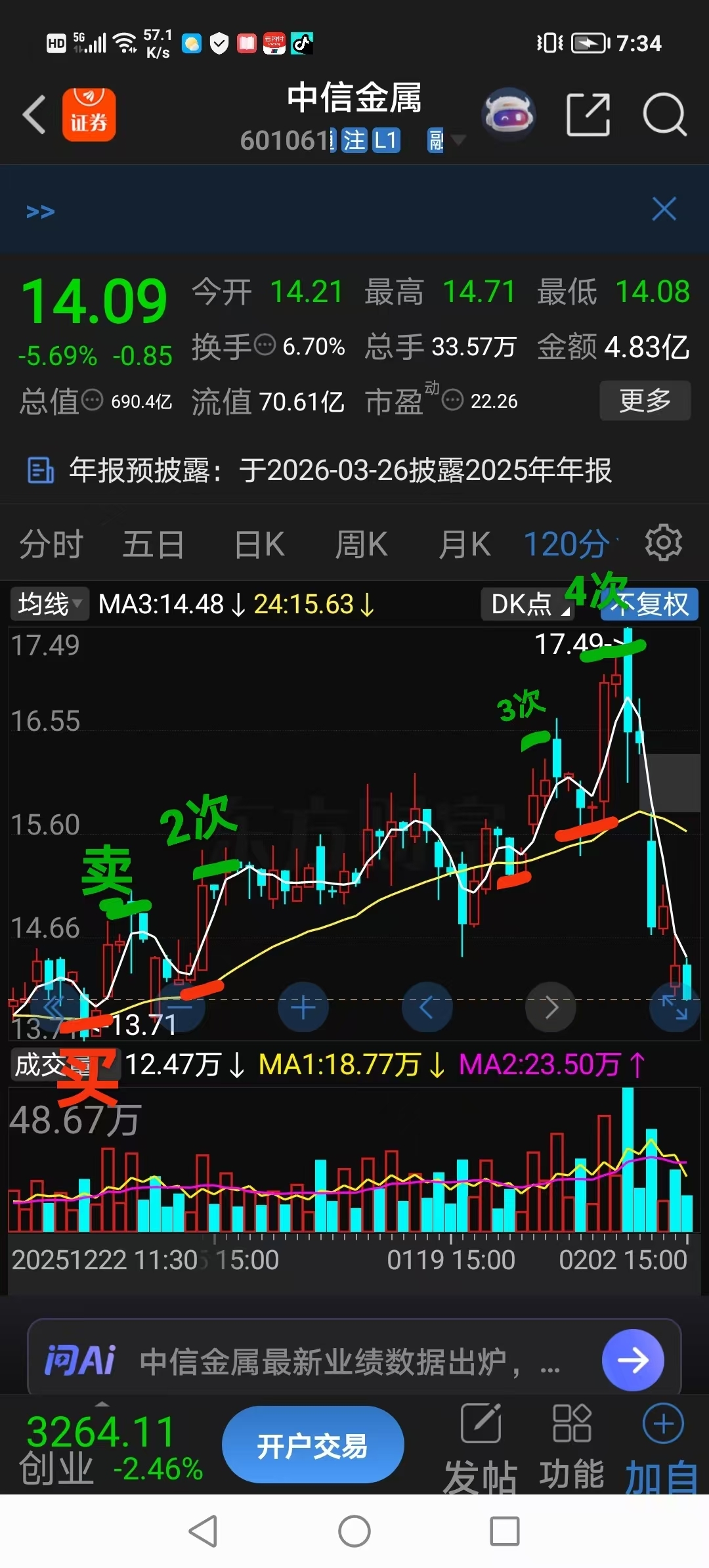 $中信金属(SH601061)$ 这波从13块4毛2涨到17块4毛9在黄线趋势上咱的4次博弈