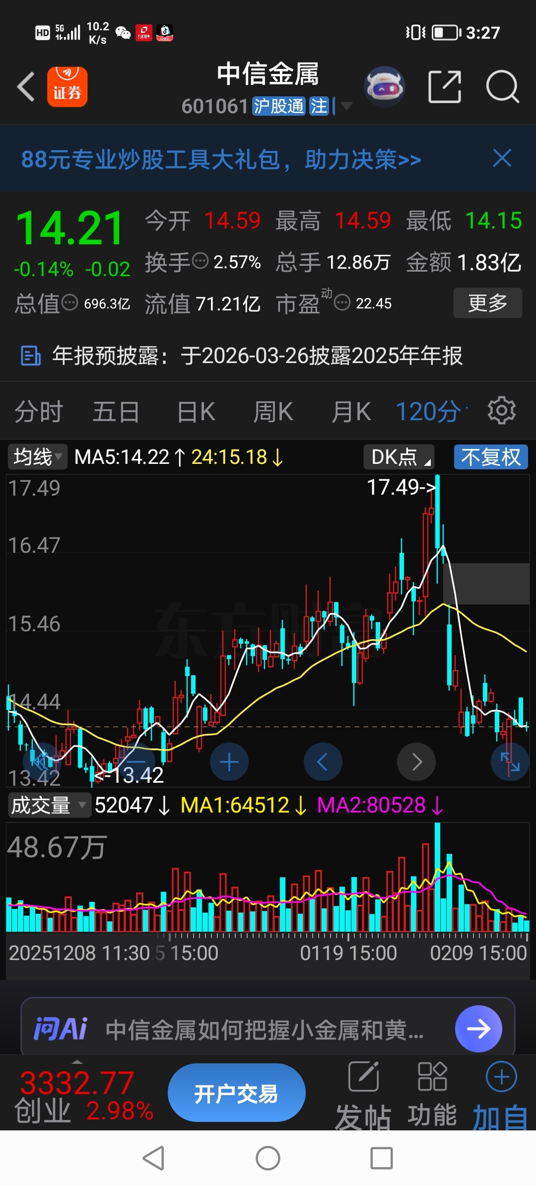 往后的每一天收盘我会用我的独创黄记录中信金属K线图!在未来的二年之内检验咱的黄线