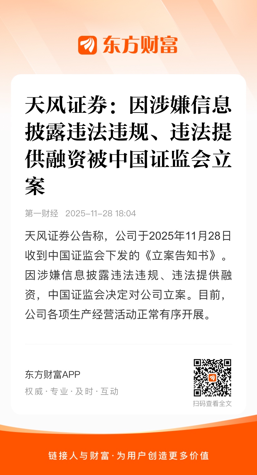 天风证券公告称,公司于2025年11月28日收到中国证监会下发的《立案告知书》。因涉嫌信息披露违法违规、违法提供融资,中国证监会决定对公司立案。目前,公司各项生产经营活动正常有序开展。