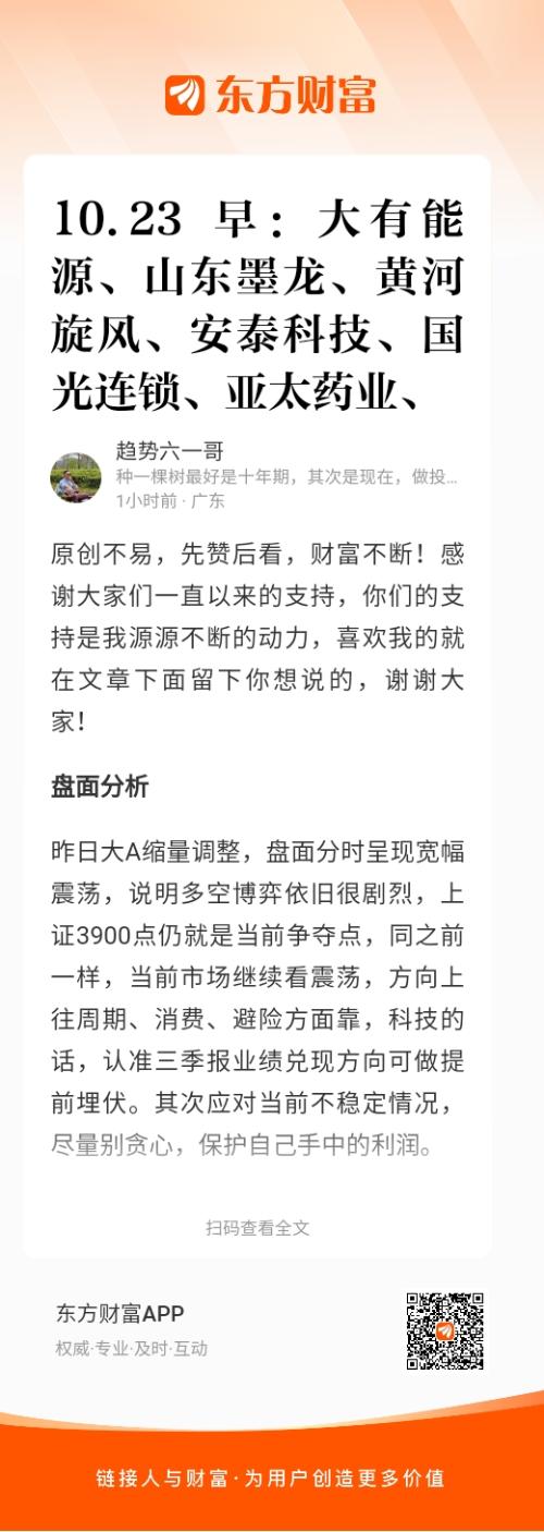 昨日大A缩量调整,盘面分时呈现宽幅震荡,说明多空博弈依旧很剧烈,上证3900点仍就是当前争夺点,同之前一样,当前市场继续看震荡,方向上往周期、消费、避险方面靠,科技的话,认准三季报业绩兑现方向可做提前埋伏。其次应对当前不稳定情况,尽量别贪心,保护自己手中的利润。
