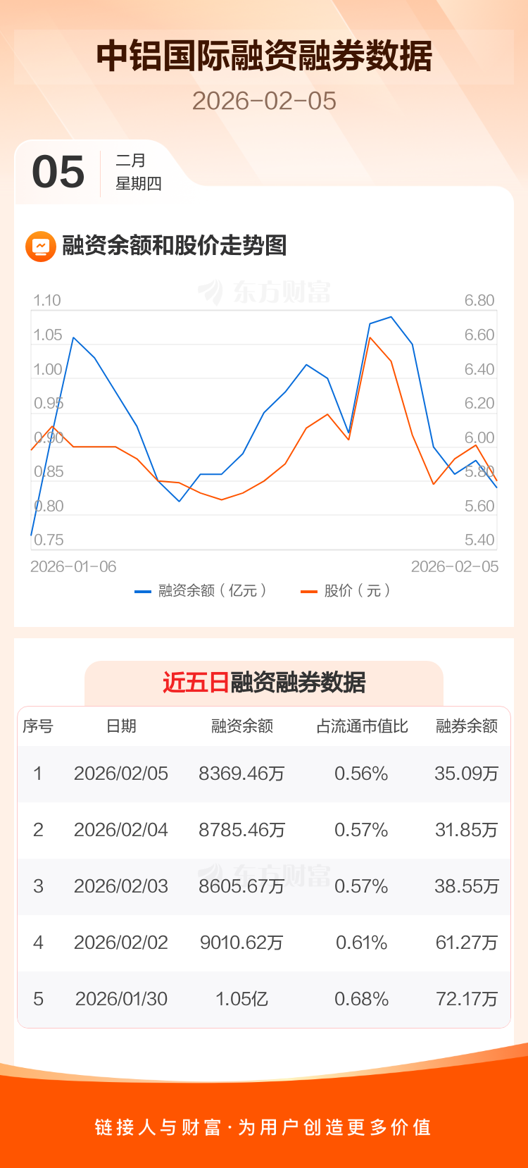 交易所最新数据显示,中铝国际于2026年2月5日获融资买入751.46万元,融资偿还1167.46万元,当日融资净偿还416万元。目前,该股融资余额8369.46万,占流通市值比例为0.56%。