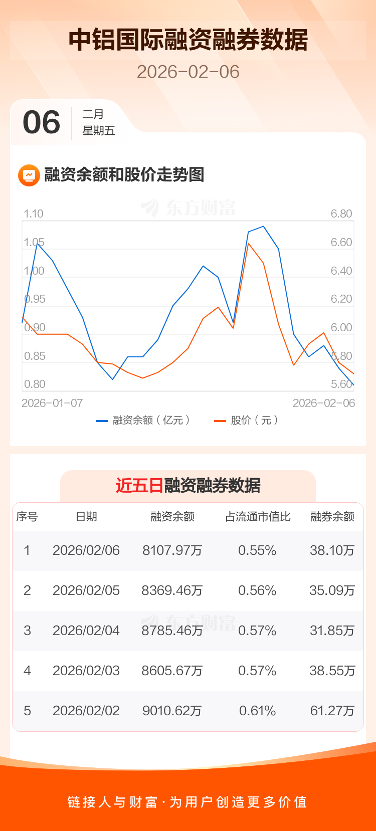 交易所最新数据显示,中铝国际于2026年2月6日获融资买入541.56万元,融资偿还803.05万元,当日融资净偿还261.49万元。目前,该股融资余额8107.97万,占流通市值比例为0.55%。